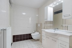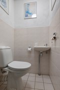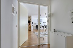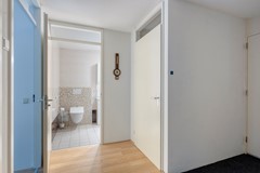 U betreedt het appartement in de lichte hal. Vanuit hier bereikt u het toilet met fonteintje, de badkamer, en een berging/wasruimte. Ook heeft u vanuit de hal toegang tot de eerste slaapkamer en woonkamer.