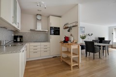 De half open keuken is uitgevoerd in lichte kleuren en voorzien van een contrasterend werkblad, een inductiekookplaat, afzuigkap, combi-oven, vaatwasser en koelkast. In de bijkeuken is naast de CV en ventilatie ook extra ruimte voor een vriezer en meerdere staande kasten. Alles is dus binnen handbereik vanuit de keuken, en u heeft verbinding met de woonkamer - perfect voor wie graag kookt én contact houdt met gasten.