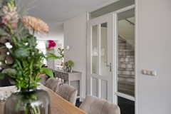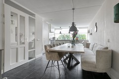 Vervolgens betreedt u de royale woonkamer, die uitblinkt door zijn open indeling en grote raampartijen. De overvloed aan licht geeft de ruimte een warme en uitnodigende sfeer. De woonkamer biedt volop mogelijkheden om een comfortabele zithoek en een sfeervolle eethoek te creëren. Eyecatcher is de haard, die niet alleen warmte, maar ook karakter toevoegt aan het interieur. Dankzij de openslaande deuren naar de achtertuin loopt binnen en buiten hier naadloos in elkaar over.