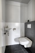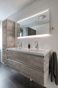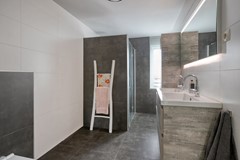 De badkamer is stijlvol betegeld en tot in de puntjes verzorgd. U vindt hier een inloopdouche met glazen wand, een zwevend toilet, en een dubbele wastafel met spiegel. De afwerking is modern en tijdloos, waardoor u hier elke dag in een frisse, ontspannen sfeer kunt beginnen of eindigen.