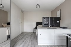 Aan de voorzijde bevindt zich de moderne, U-vormige keuken, die in open verbinding staat met de woonkamer. Hier beschikt u over een compleet keukenblok met Boretti gasfornuis met oven, ingebouwde stoom-ovencombinatie, koelkast, vaatwasser, spoelbak en voldoende opbergruimte in zowel lades als kastjes. De moderne uitstraling, gecombineerd met het praktische barretje, maakt dit een fijne plek om te koken én samen te komen.