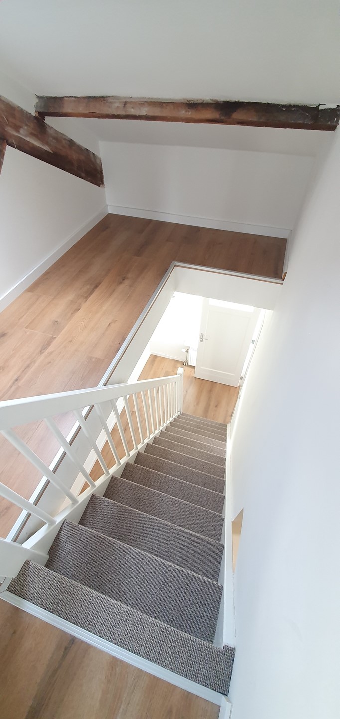 The newly carpeted staircase leads to the upper floor, which offers two more spacious bedrooms and a second bathroom.