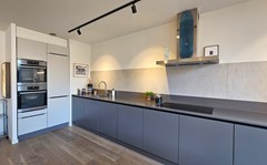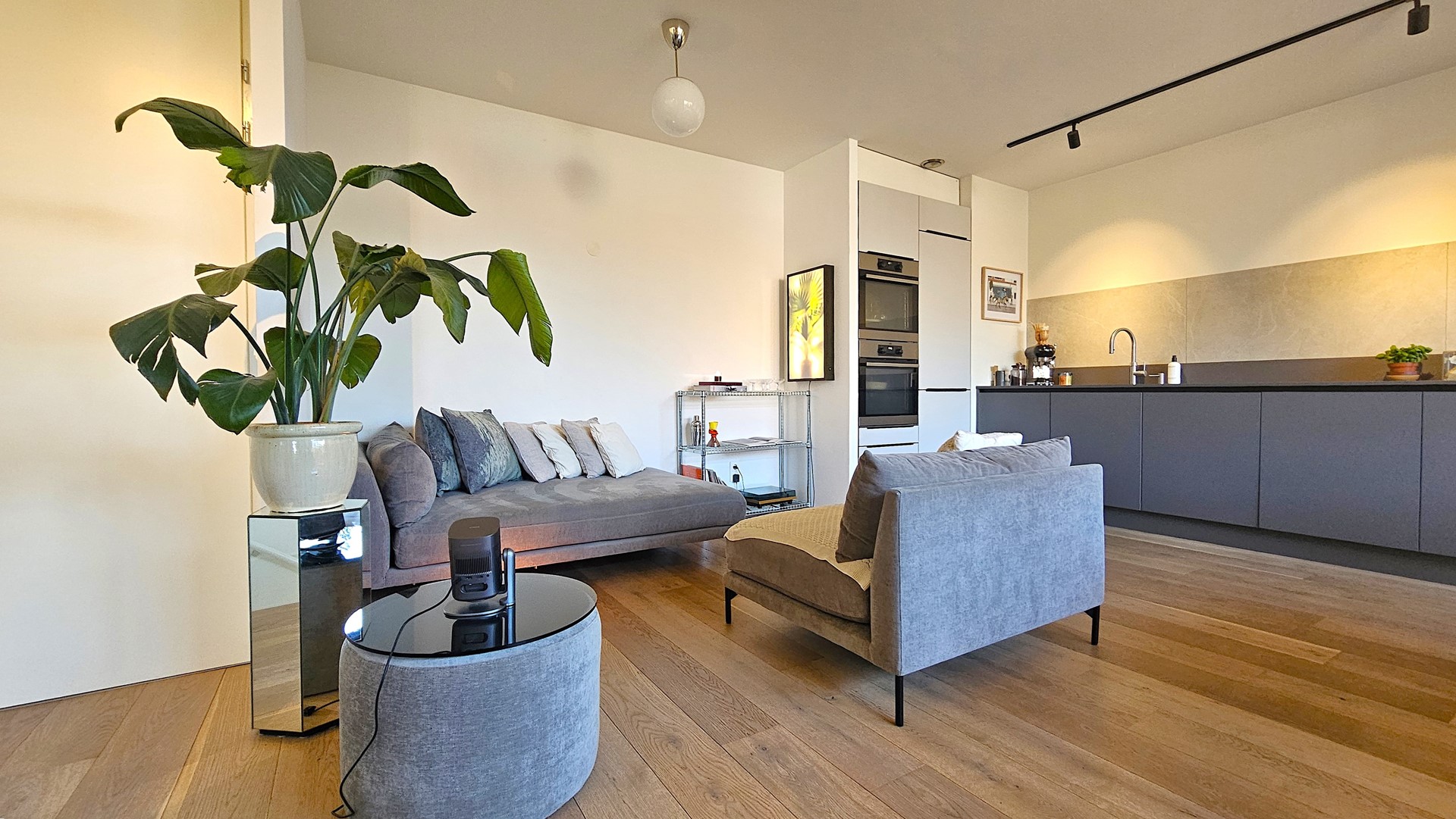 Landing with a separate toilet and access to the spacious and tastefully finished living room. Large windows allow for abundant natural light. The modern open-plan kitchen is equipped with various built-in appliances and has a practical, luxurious layout that suits today's living needs.