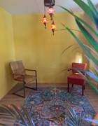 This nice and colorful apartment is a boarding pass and, in addition to a spacious living room with open kitchen, has a spacious bedroom and compact but fully equipped bathroom.
