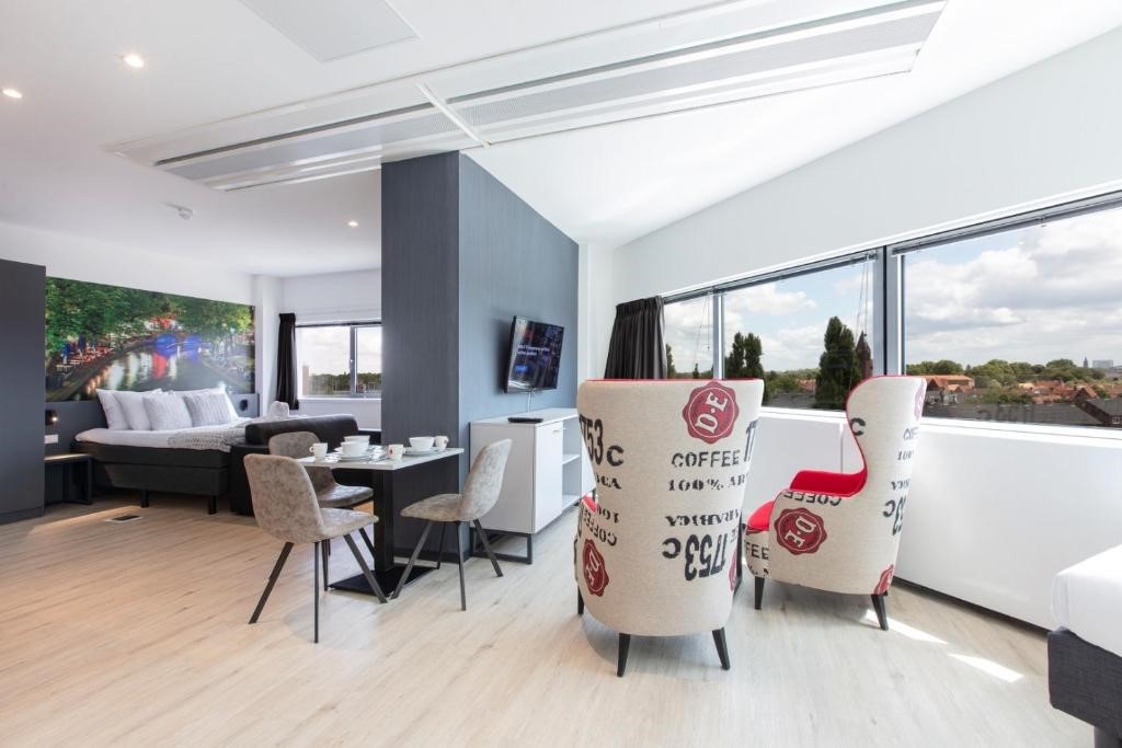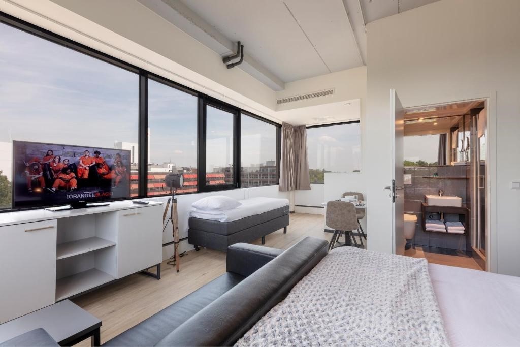 This studio of 26 m2 has all the luxury and convenience for expats and young professionals. In addition to the luxurious kitchen and bathroom, there is a separate table with 2 comfortable chairs for working and eating. Many outlets are equipped with a USB connection so that charging of electronic devices is already possible in the studio. The modern 2-person box-spring bed has a built-in adjustable color lighting in the headboard so that you can determine your own atmosphere in the room.