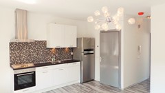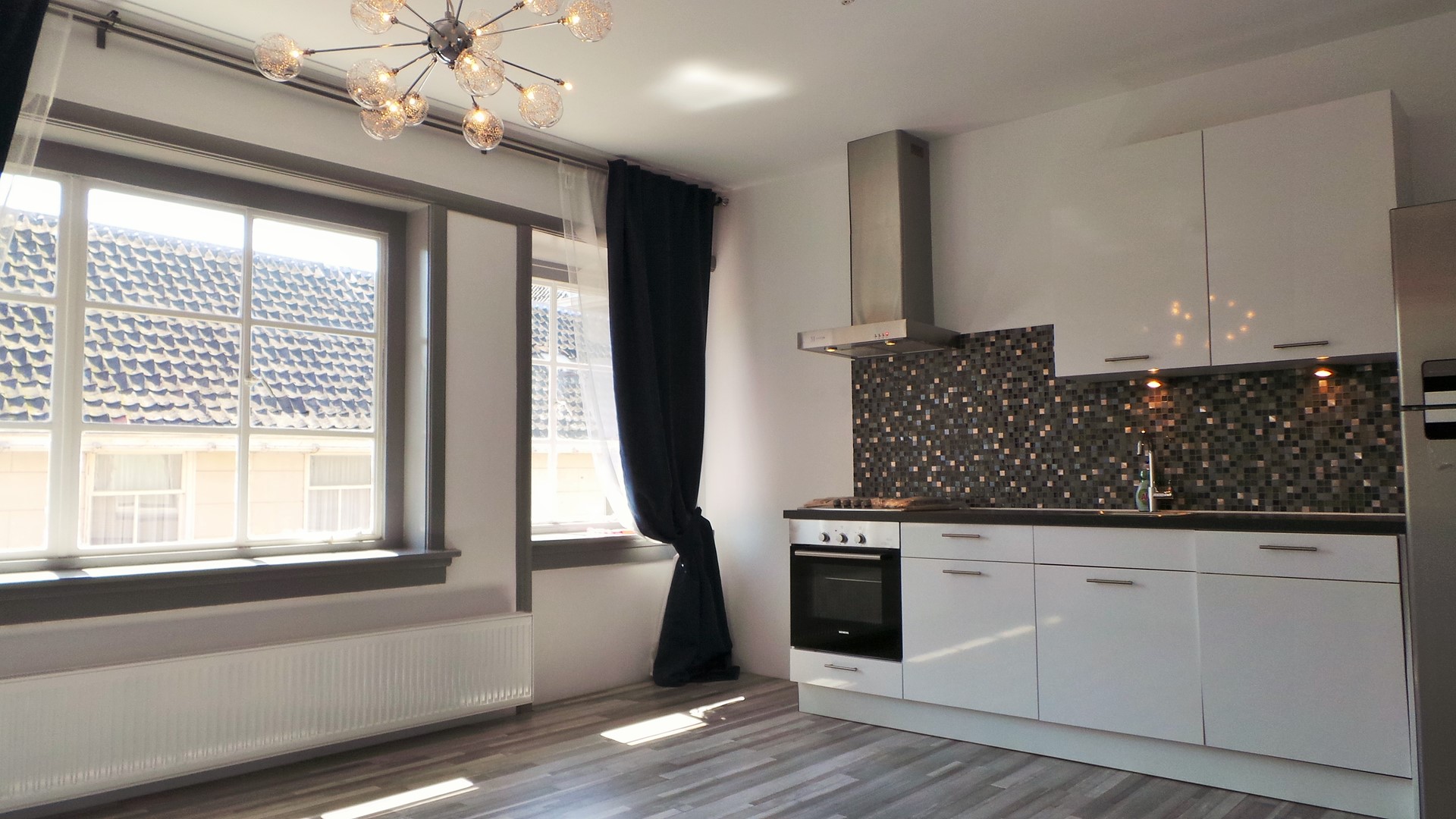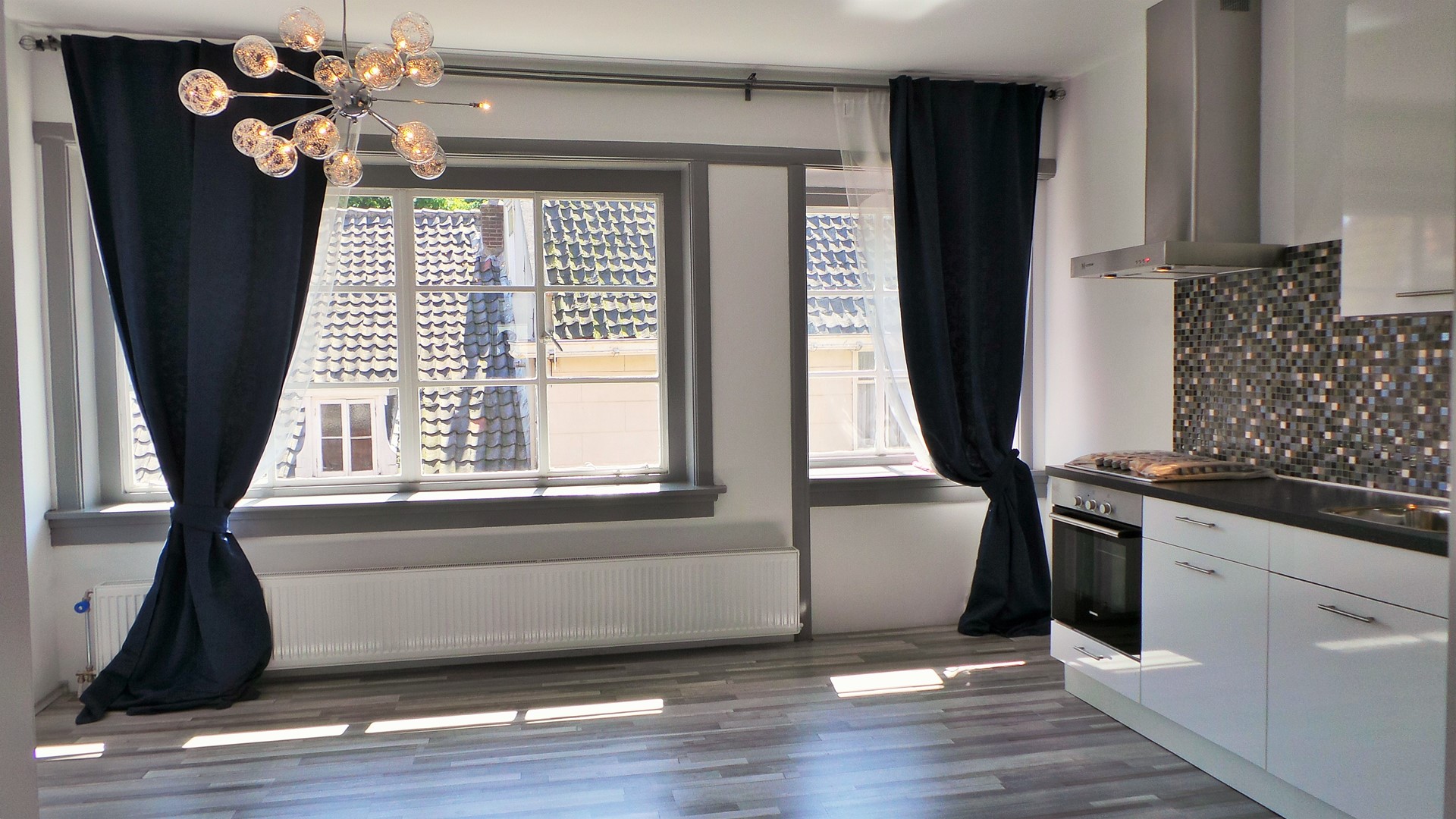 Entrance through closed fire gate to a shared porch. The 1st floor can be reached via the stairwell. Spacious living room with open kitchen and bay window overlooking the shopping street. The kitchen is luxuriously equipped with a built-in hob, stainless steel extractor hood, oven, fridge-freezer and dishwasher.