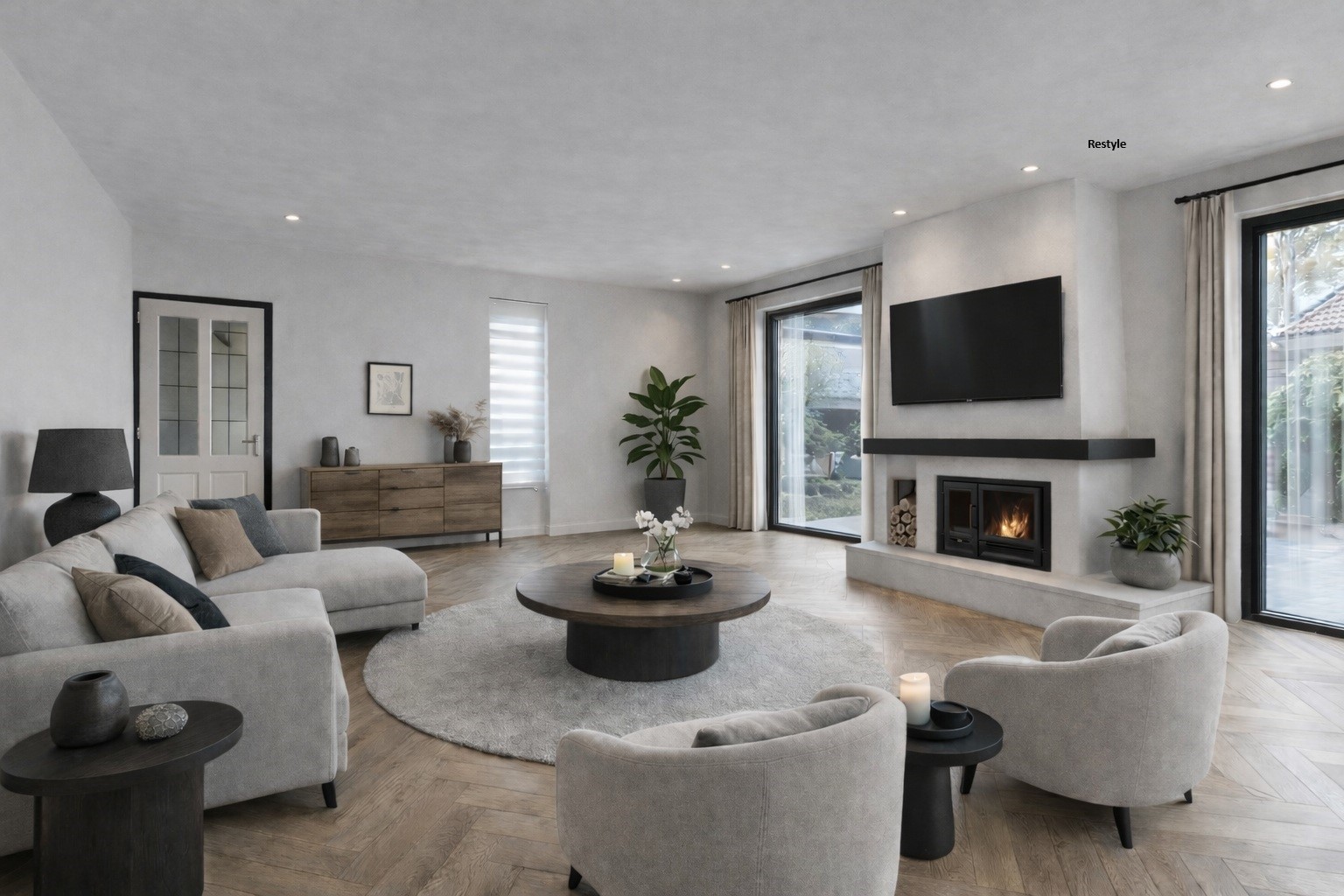 The front living room has an open layout, is filled with natural light, and offers plenty of space to create a comfortable sitting and dining area. A characteristic electric fireplace adds atmosphere and warmth to the room.