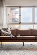Through the entrance with guest toilet, one enters the living room with windows from top to buttom, high ceilings and free view. Audio and video equipment, TV as well as a fire place have been installed in a taylor made cupboard, so no wires visible. The wooden floors give this house a warm atmosphere and the light is pouring in through the large top-to-buttom windows everywhere, giving a feeling of Summer.