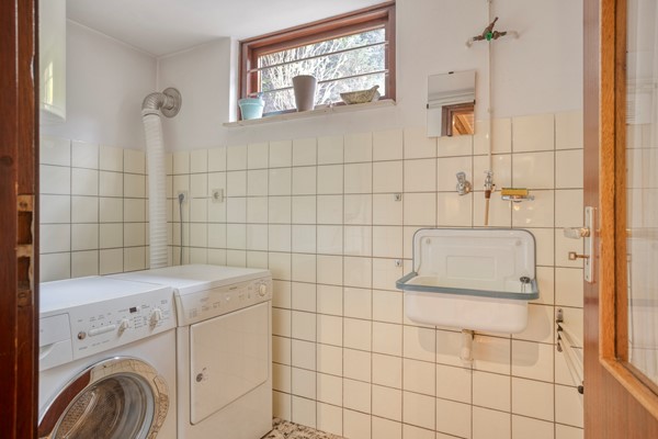 De wasruimte is praktisch ingericht en voorzien van aansluitingen voor was- en droogapparatuur. Daarnaast is er voldoende plek voor extra opslag.
