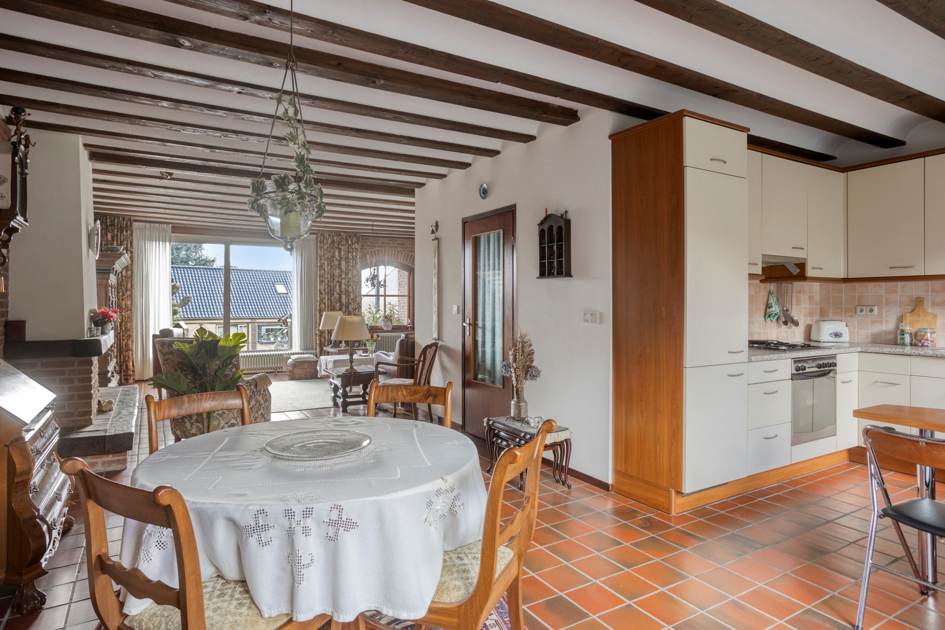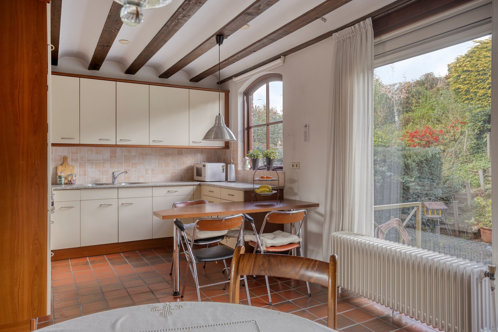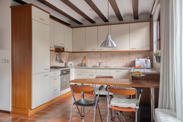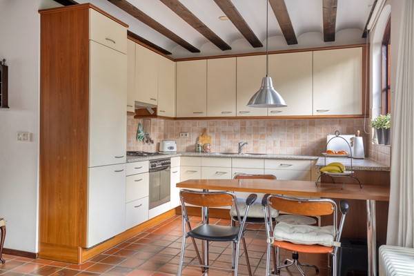 De open keuken aan de achterzijde is uitgevoerd in een praktische U-opstelling. De keuken is voorzien van diverse inbouwapparatuur en beschikt over voldoende kastruimte.