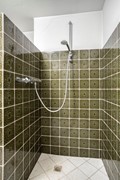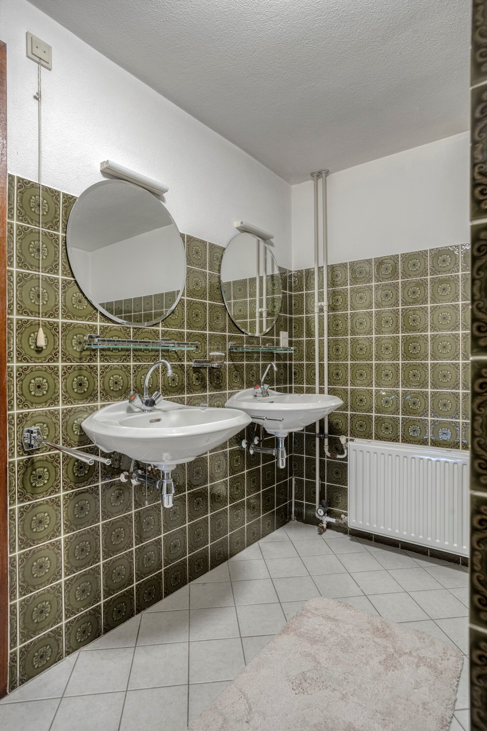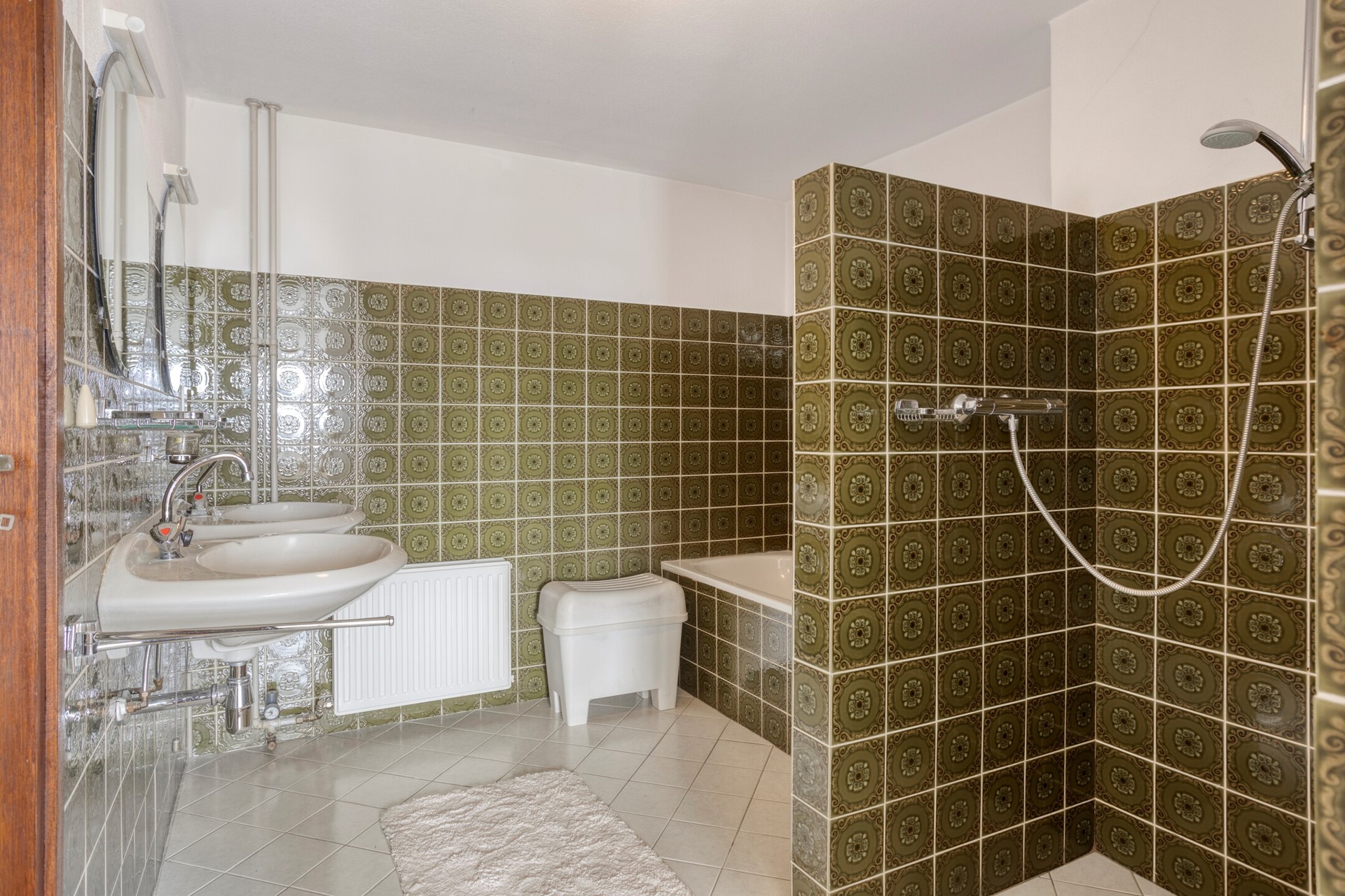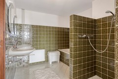 De badkamer is ruim opgezet, volledig betegeld en uitgerust met een ligbad, een dubbele wastafel en een inloopdouche.