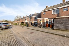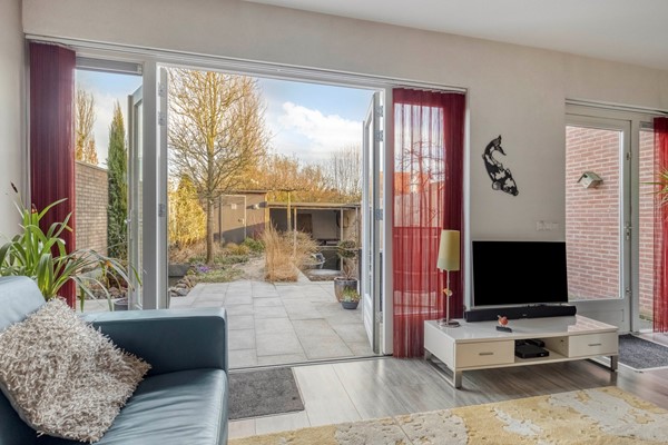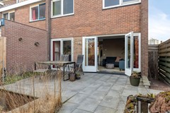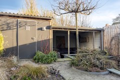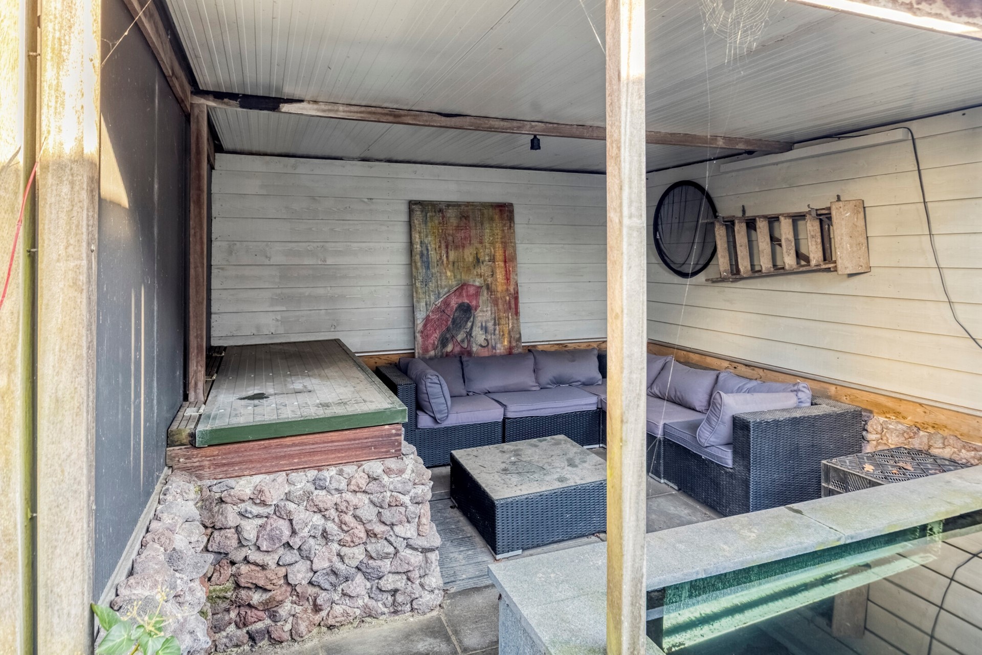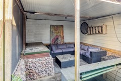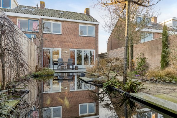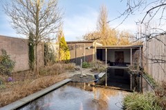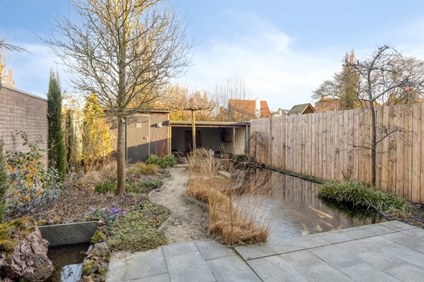 De achtertuin is verrassend diep en met zorg aangelegd. Direct achter de woning ligt een ruim terras, waarna de tuin overgaat in een speels vormgegeven pad langs een grote vijverpartij. Beplanting en volwassen bomen zorgen voor een groene uitstraling en privacy. Achter in de tuin bevindt zich een sfeervolle overkapping, waar u beschut kunt genieten van lange avonden buiten. Daarnaast is ook hier een berging aanwezig, en er is een praktische achterom, die u naar de voorzijde van de woning leidt. Deze tuin biedt niet alleen plek om te ontspannen, maar ook om te genieten van rust en natuur in eigen omgeving.