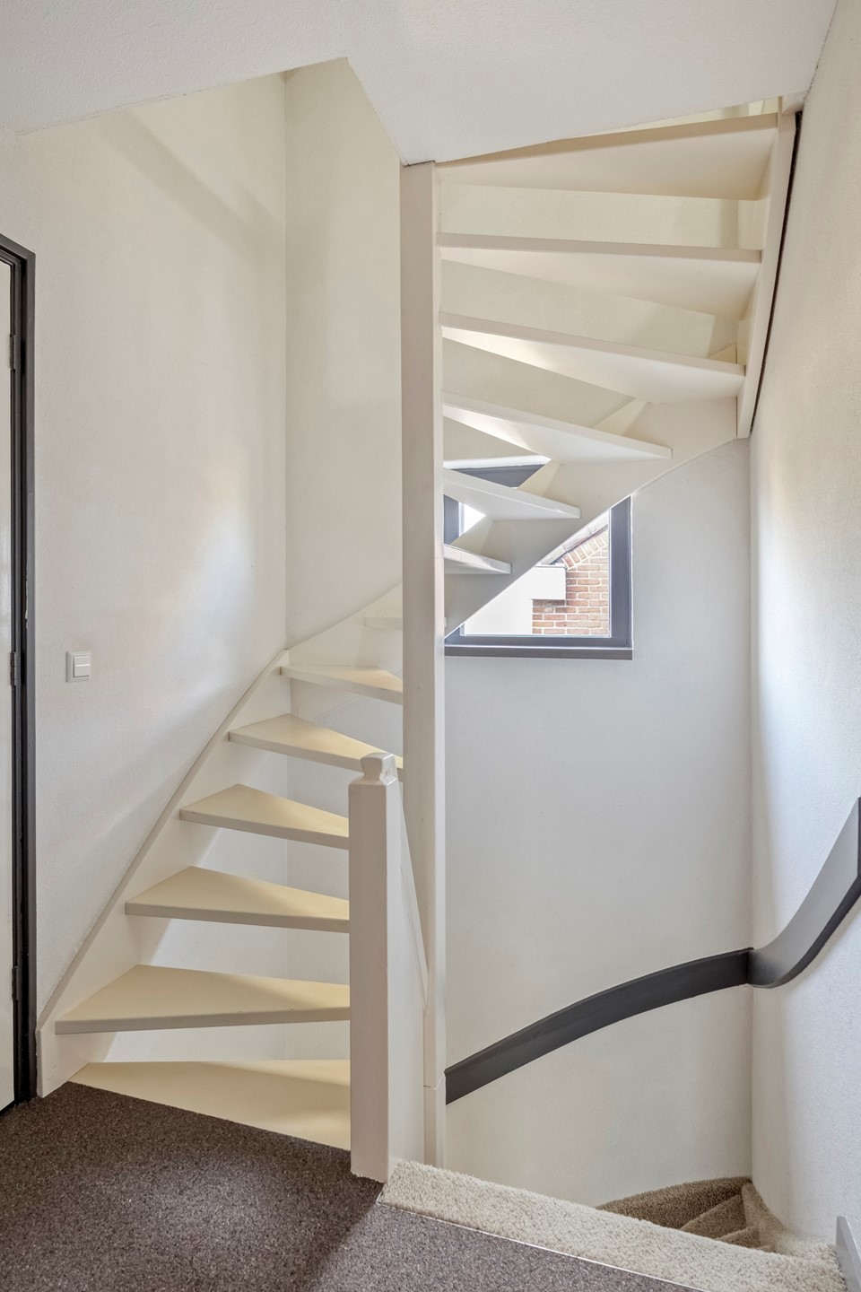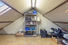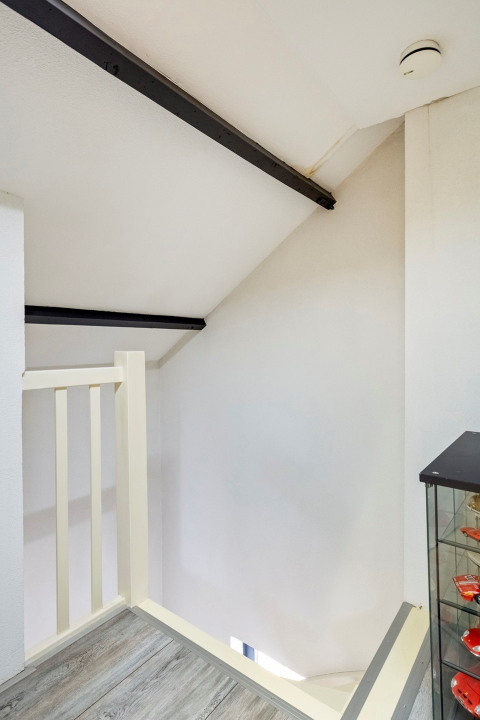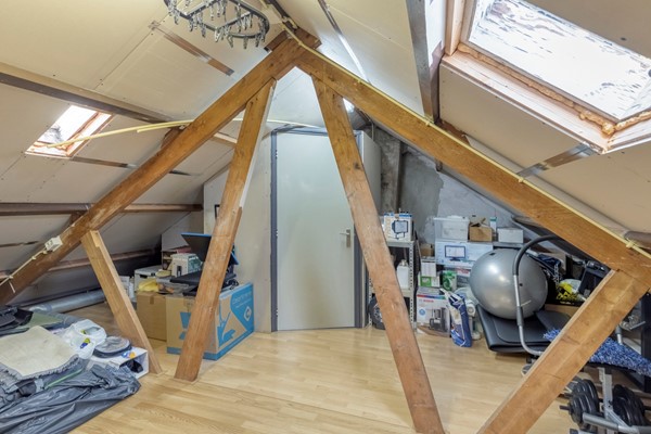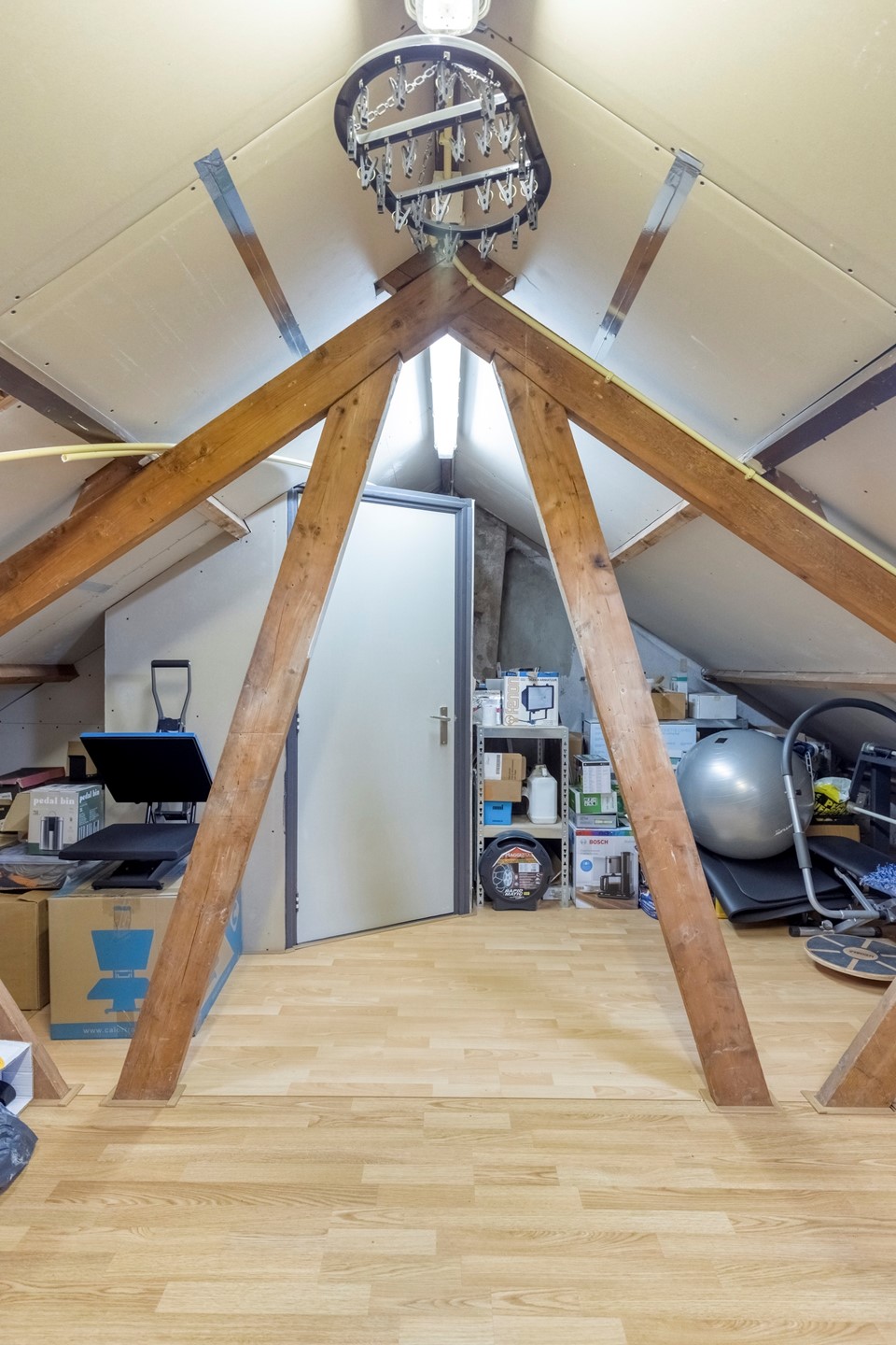 Via een vaste trap bereikt u de tweede verdieping. Hier bevindt zich een royale zolderkamer met dakramen en zichtbare houten balken, wat de ruimte karakter geeft. Dankzij de hoogte en het vloeroppervlak is dit een kamer die zich kan lenen als extra slaapkamer, hobbyruimte of thuiswerkplek.