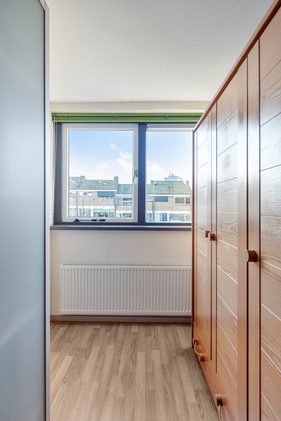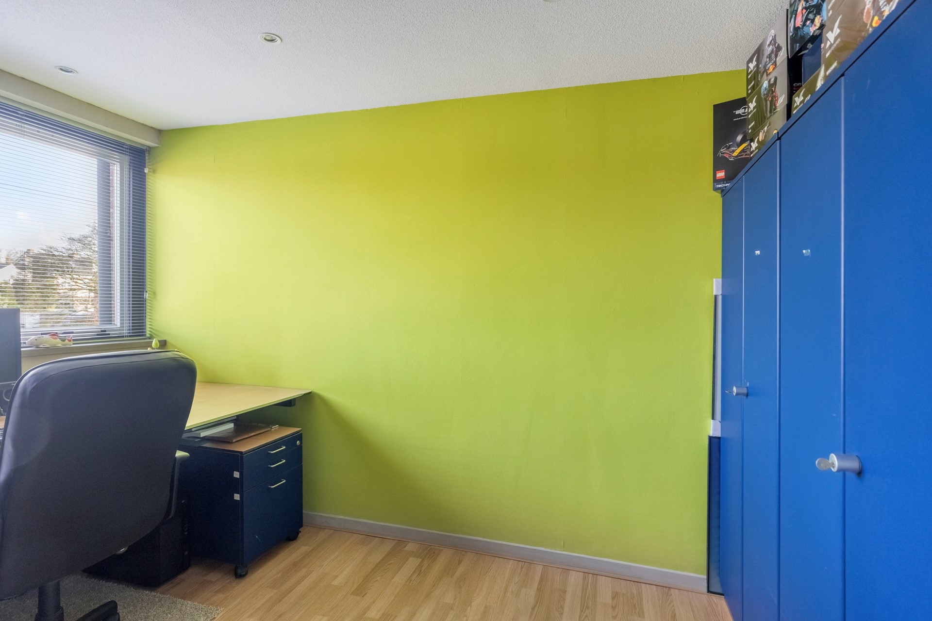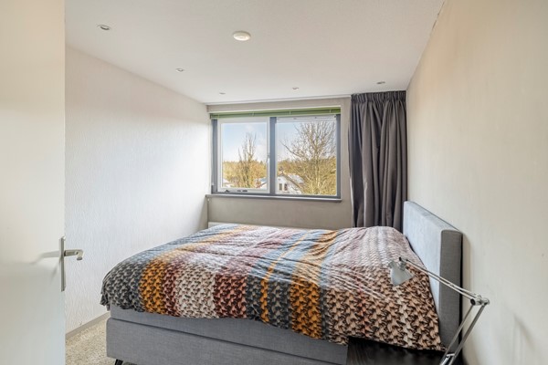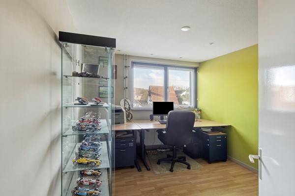 Via een vaste trap bereikt u de tweede verdieping. Hier bevindt zich een royale zolderkamer met dakramen en zichtbare houten balken, wat de ruimte karakter geeft. Dankzij de hoogte en het vloeroppervlak is dit een kamer die zich kan lenen als extra slaapkamer, hobbyruimte of thuiswerkplek.