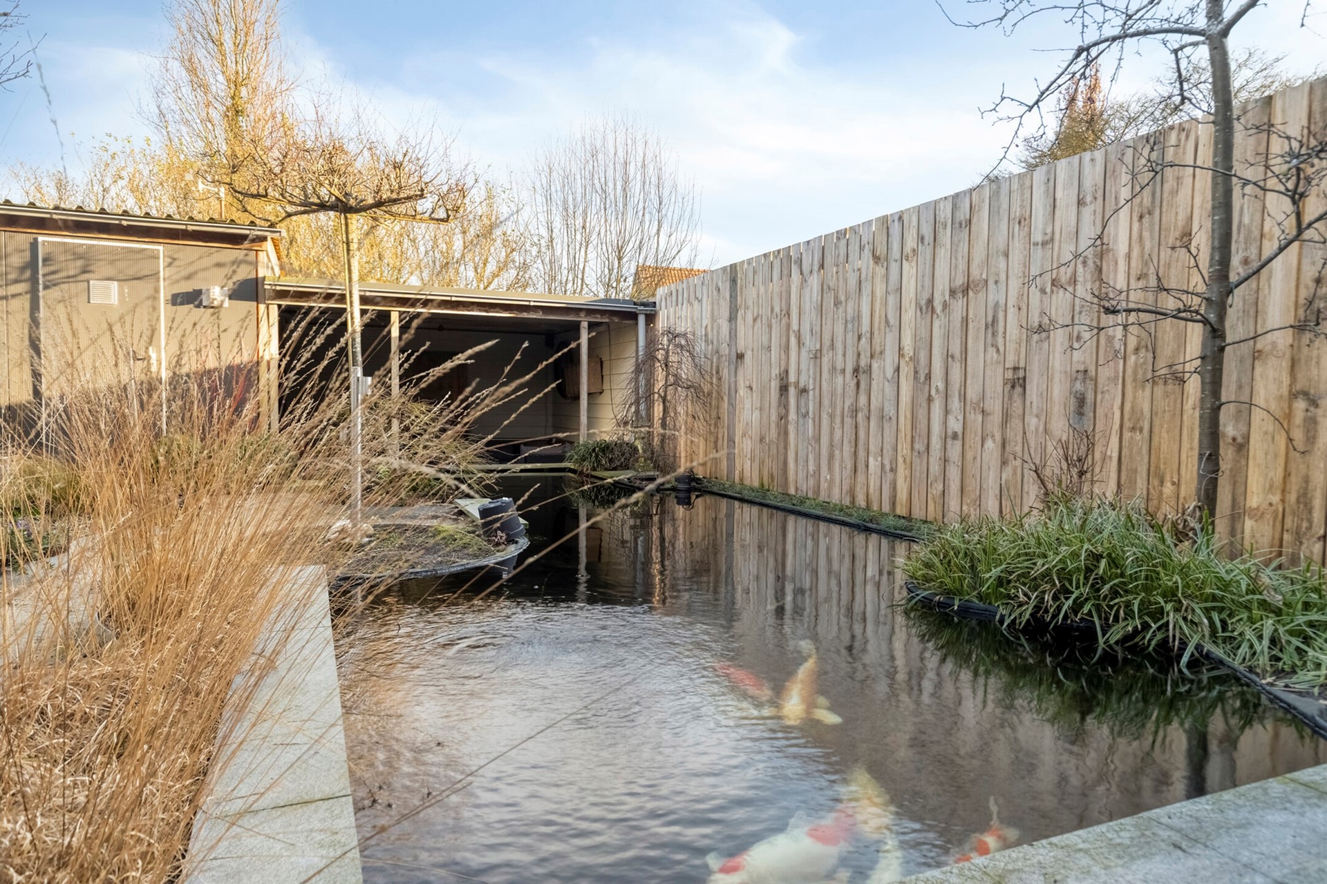 Moderne hoekwoning met een verrassend diepe tuin met vijver, berging en sfeervolle overkapping