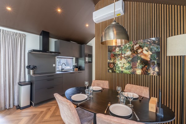 Binnen vind je een sfeervolle woonkamer met grote openslaande deuren naar de tuin, waardoor binnen en buiten naadloos in elkaar overlopen. De open keuken is volledig uitgerust met moderne apparatuur, zoals een combimagnetron, oven, Nespresso-apparaat, inductiekookplaat en een vaatwasser, ideaal voor gezellige avonden koken met uitzicht op het bos.