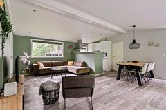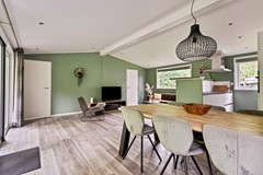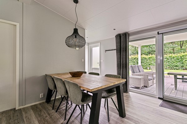 Bij binnenkomst in de woonkamer valt direct de overvloed aan natuurlijk daglicht op. Het puntdak zorgt voor een ruimtelijk gevoel, terwijl de grote ramen een rustgevend uitzicht op de omringende natuur bieden. De eetkamer heeft voldoende ruimte voor een 4-persoons eettafel. De open indelinig biedt volop mogelijkheden voor het creëren van een royale zit- en eethoek.
