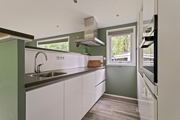 Aangrenzend aan de woon- en eetkamer bevindt zich de keuken. Het lange aanrechtblad is voorzien van een inductiekookplaat, een ingebouwde oven, een koelkast, een vaatwasser en een spoelbak. De kastjes en lades bieden creëren slimme opbergmogelijkheden.