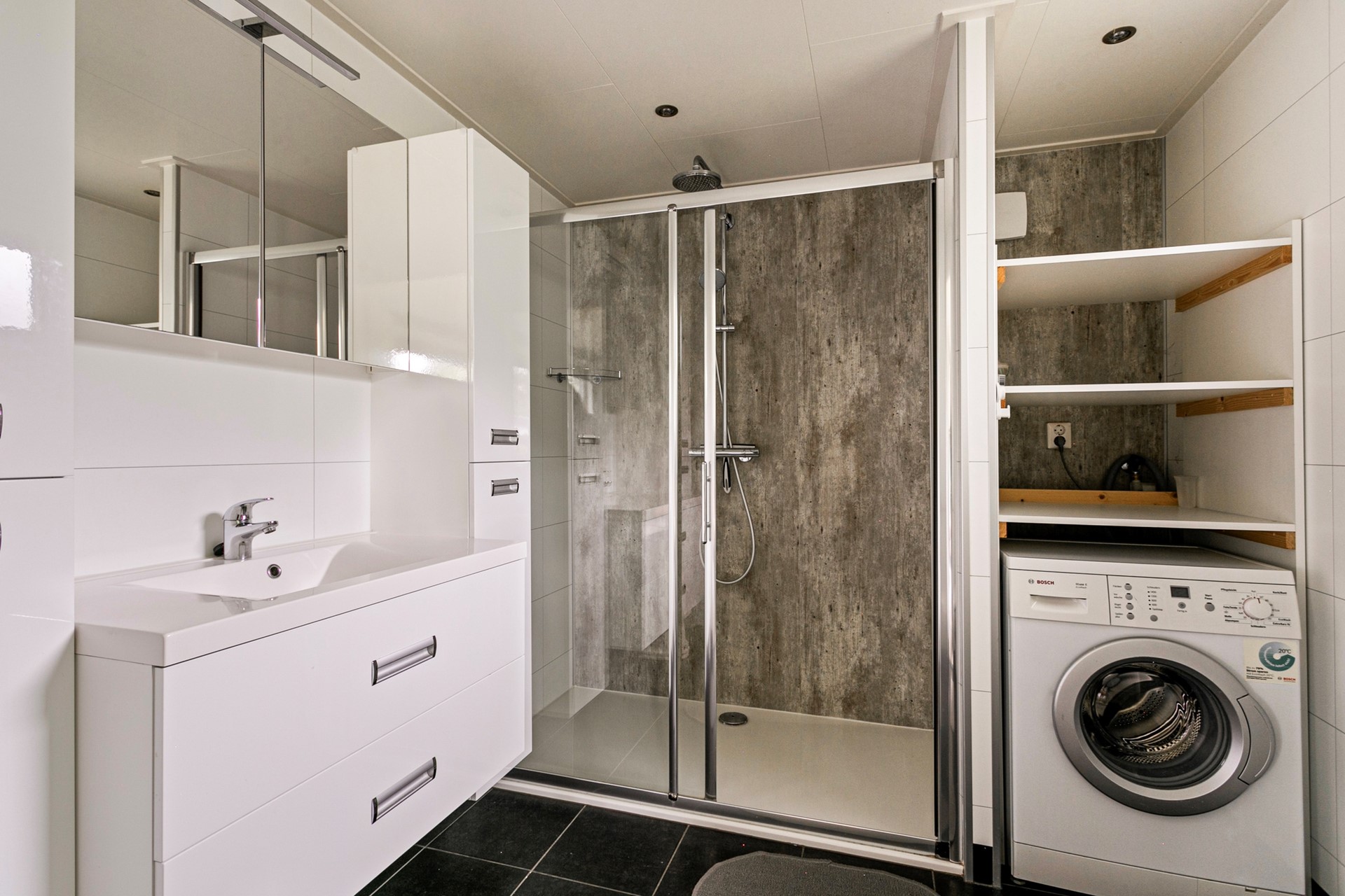 - Badkamer met ruime douchecabine, witgoedaansluiting, zwevend toilet, wastafel met opbergmeubel