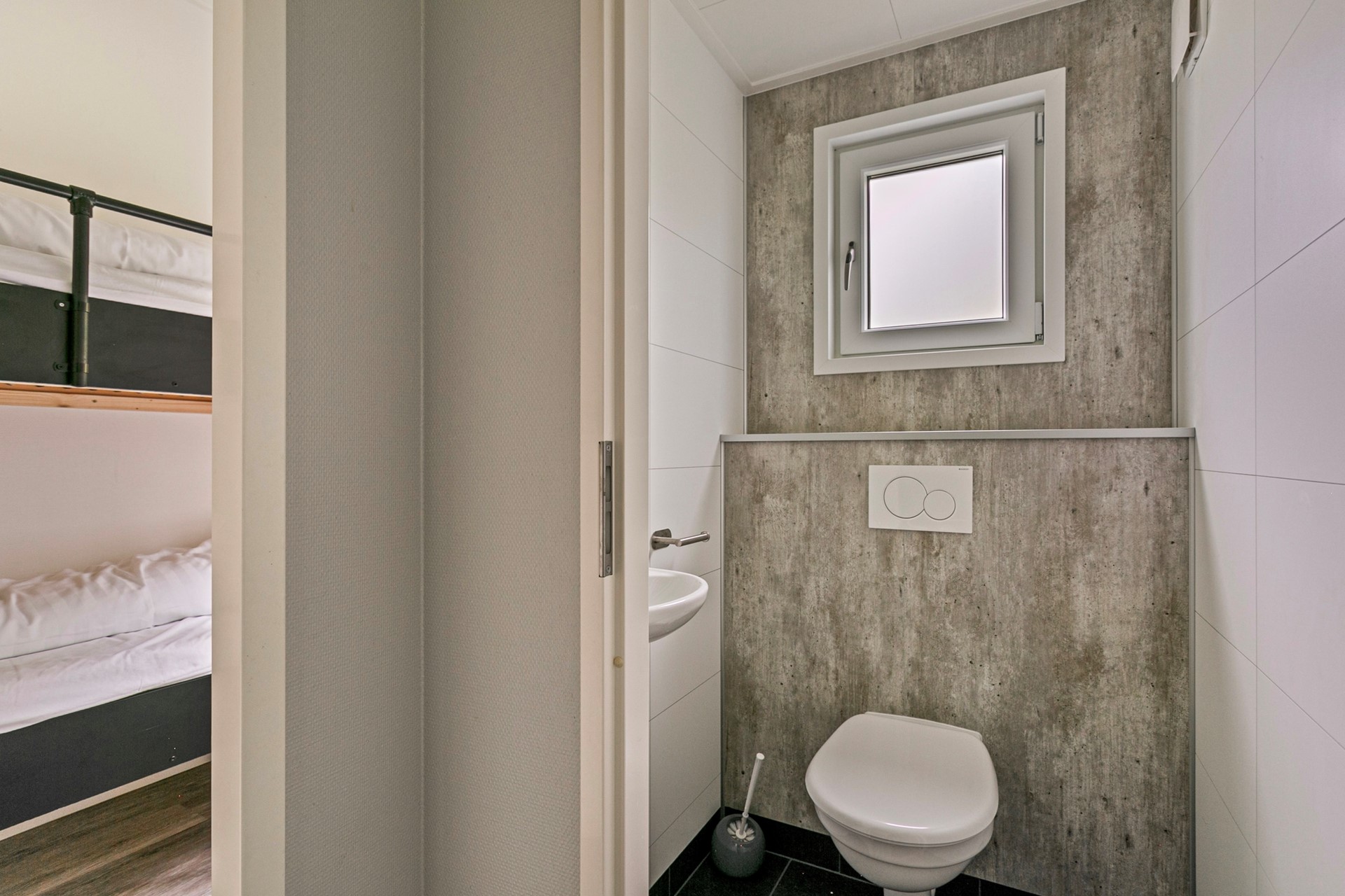 Via de poort betreedt u het aangelegde pad naar de woning, waarna u via de voordeur in een goed afgewerkte hal komt. Deze hal biedt toegang tot een slaapkamer, een separate toiletruimte en de woonkamer. De toiletruimte is deels betegeld en voorzien van een zwevend toilet met wastafel.