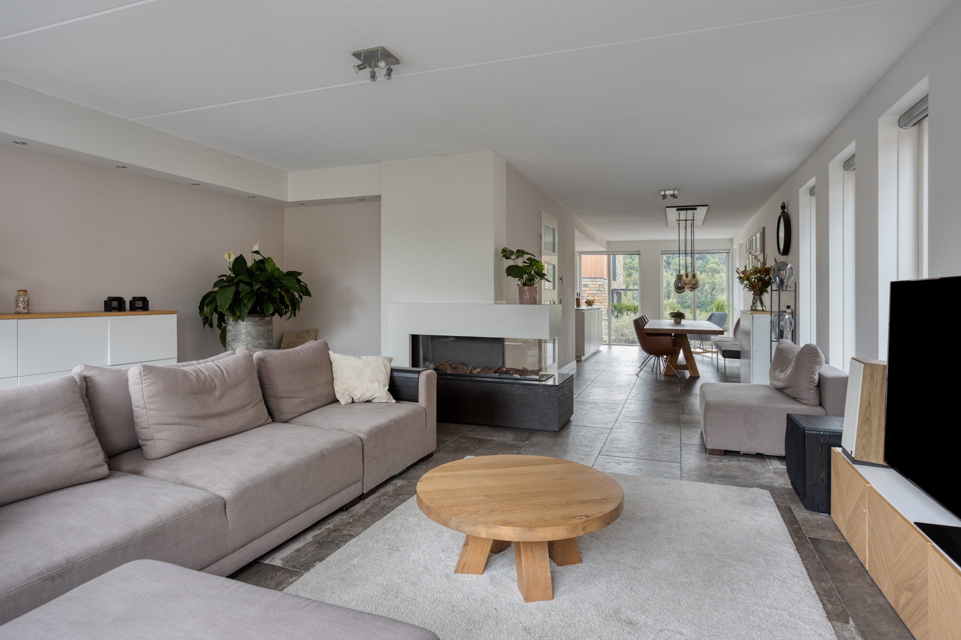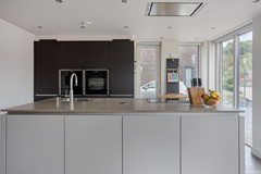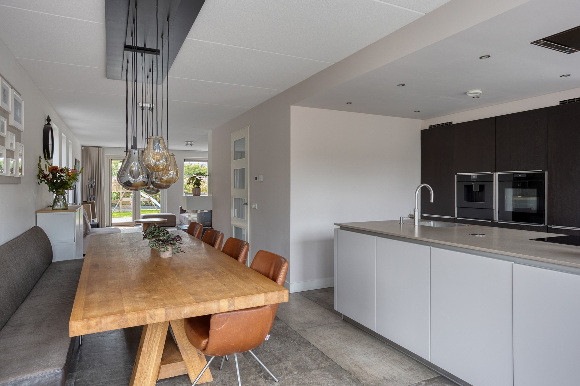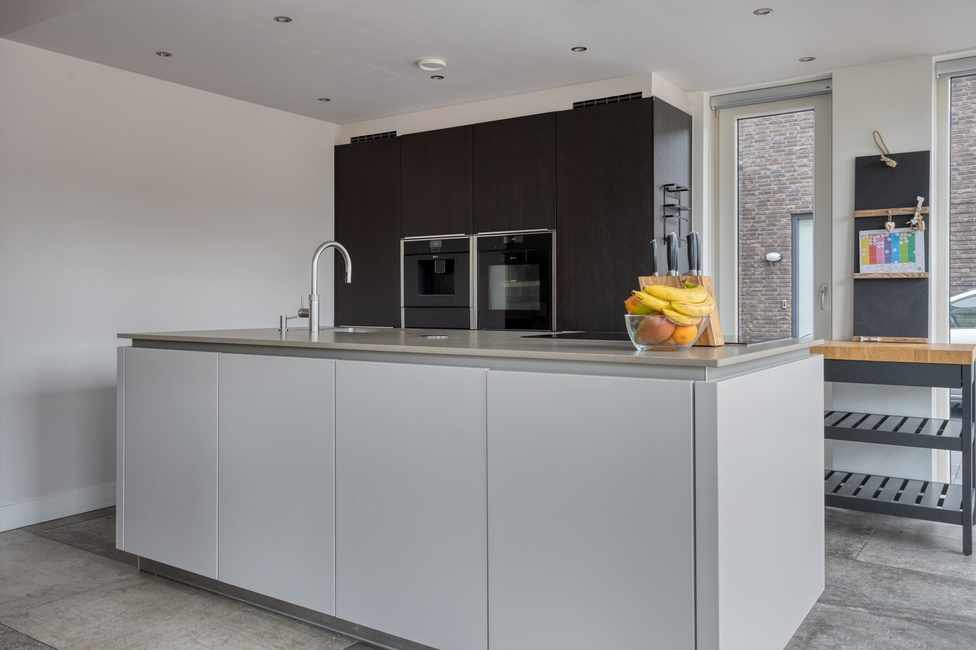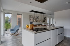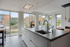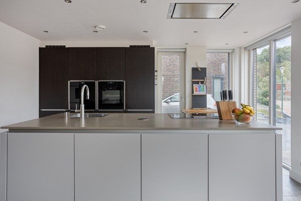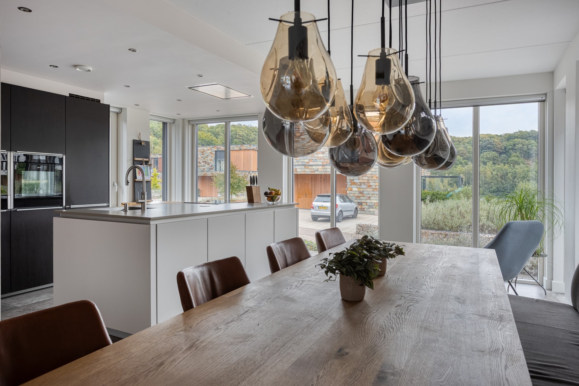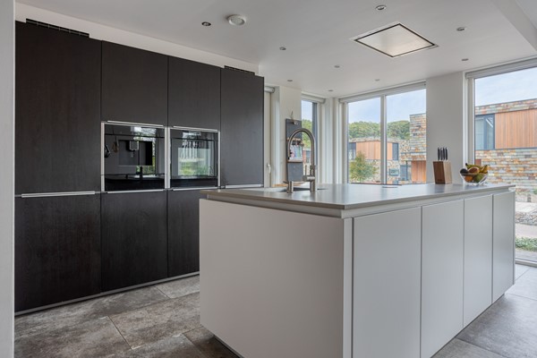 Via de ruime entree met modern toilet en trapopgang richting de eerste verdieping komt u in de woonkamer, waar de lichtinval direct opvalt. De stijlvolle haard vormt een subtiel middelpunt tussen de zit- en eethoek en zorgt voor warmte en sfeer. De keuken is een echte eyecatcher: strak vormgegeven met een groot kookeiland, composiet werkblad en alle apparatuur die u kunt wensen, waaronder een inductiekookplaat, plafondafzuiging, (stoom)oven, vaatwasser, koelkast, vriezer, Quooker en een volautomatische koffiemachine. De plafondhoge raampartijen bieden uitzicht op de groene omgeving en zorgen ook hier voor volop lichtinval.
