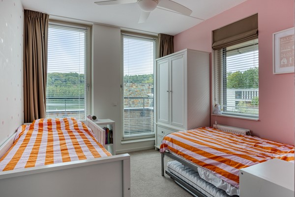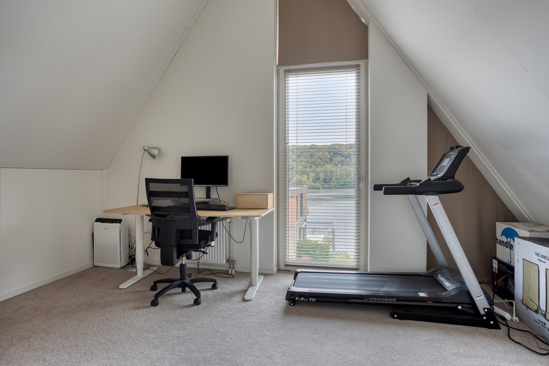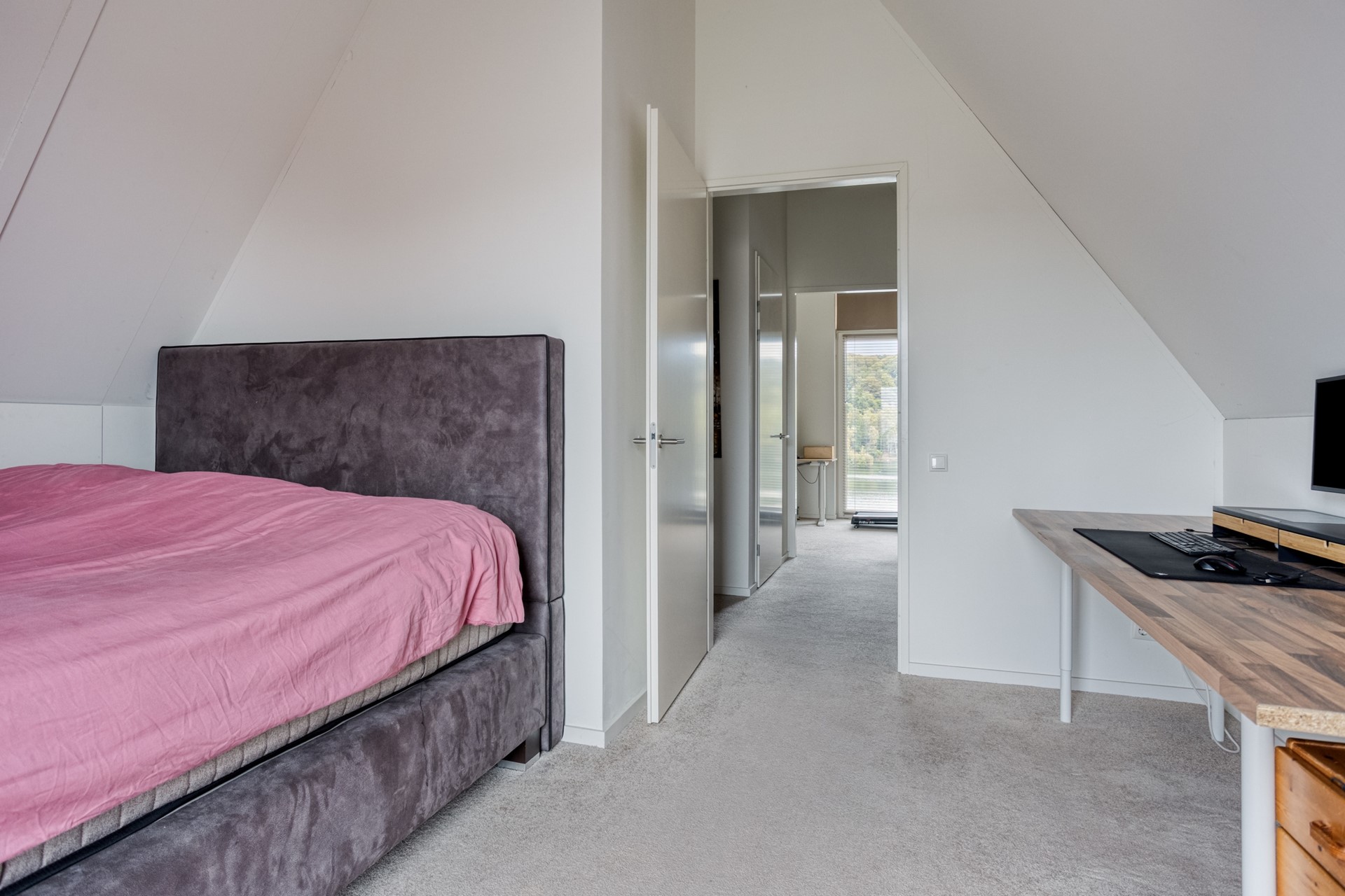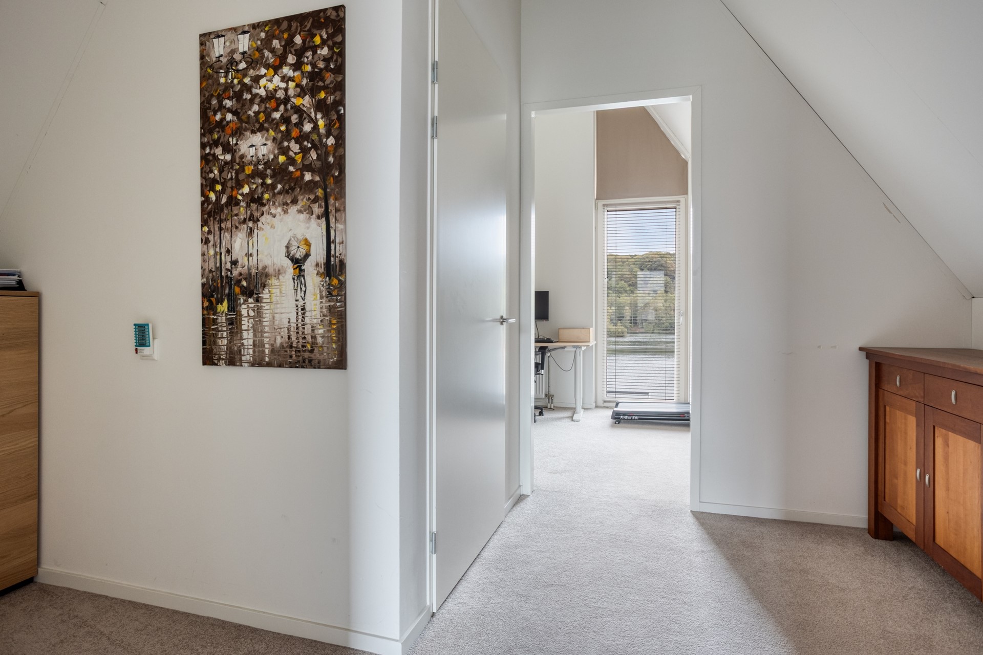 Onder de hoge, karakteristieke kap bevindt zich een verrassend ruime verdieping met nog twee ruime slaapkamers en een berging/wasruimte. Dankzij de hoge nok en grote raampartijen voelt deze verdieping licht en open aan. Deze ruimte leent zich uitstekend als tienerverdieping, logeerruimte of thuiskantoor – aan flexibiliteit geen gebrek. En ook vanuit hier heeft u een prachtig uitzicht op het water en het achterliggende natuurgebied.