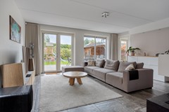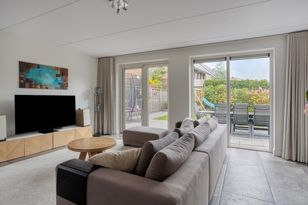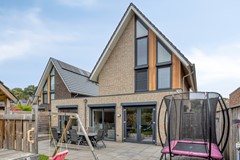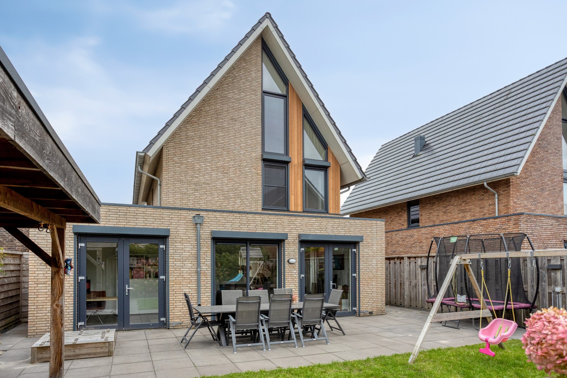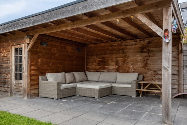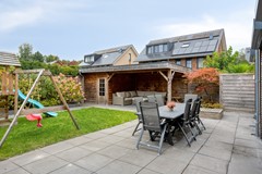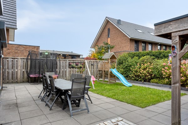 De achtertuin is verzorgd aangelegd met een groot terras, gazon en een houten overkapping waar u het hele jaar door beschut kunt zitten. De tuin biedt volop privacy en is groot genoeg voor spelende kinderen, zomerse diners of rustige avonden bij een haardvuur. De vrijstaande berging biedt extra opslagruimte, en de oprit aan de voorzijde biedt plek voor meerdere auto’s. Dankzij de moderne gevel, het stijlvolle kleurgebruik en de strakke lijnen is het geheel een lust voor het oog.