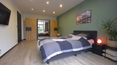 At the rear is the spacious bedroom, quietly situated and large enough for a double bed and a wardrobe. Directly adjacent is the bathroom, which is surprisingly well-equipped. Here you'll find a neat shower, a comfortable bathtub, and a washbasin with a stylish vanity. An added luxury: the bathroom offers direct access to the garden, creating a wonderfully spacious and practical feel – perfect for a quick getaway or simply relaxing after a long day.