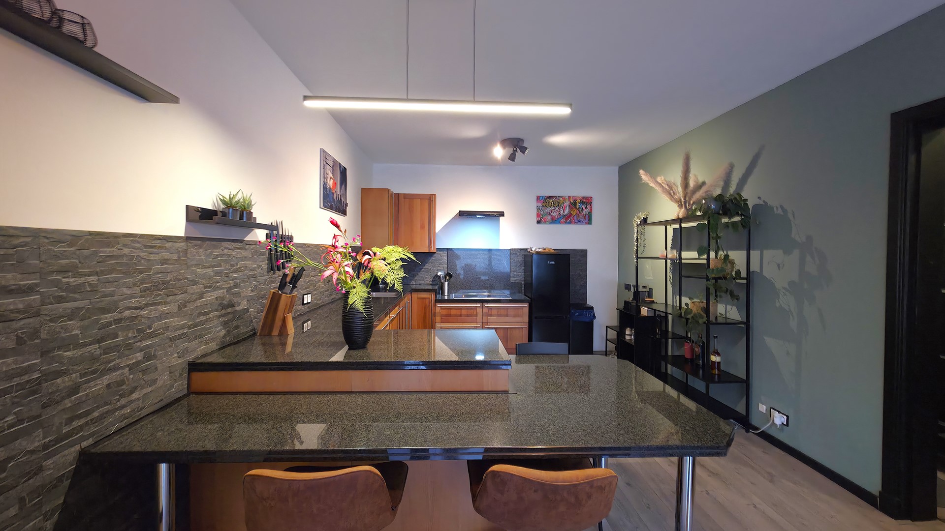 The living room at the front is spacious and offers more than enough space for a comfortable seating area and dining table. The laminate flooring, installed in 2023, creates a modern, tranquil feel. Adjacent is the open-plan kitchen, functionally laid out and equipped with built-in appliances, including a dishwasher replaced in 2024.