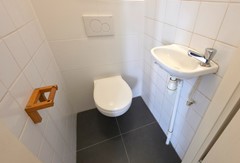 Het toilet is uitgevoerd als een modern hangend toilet en voorzien van een fonteintje.