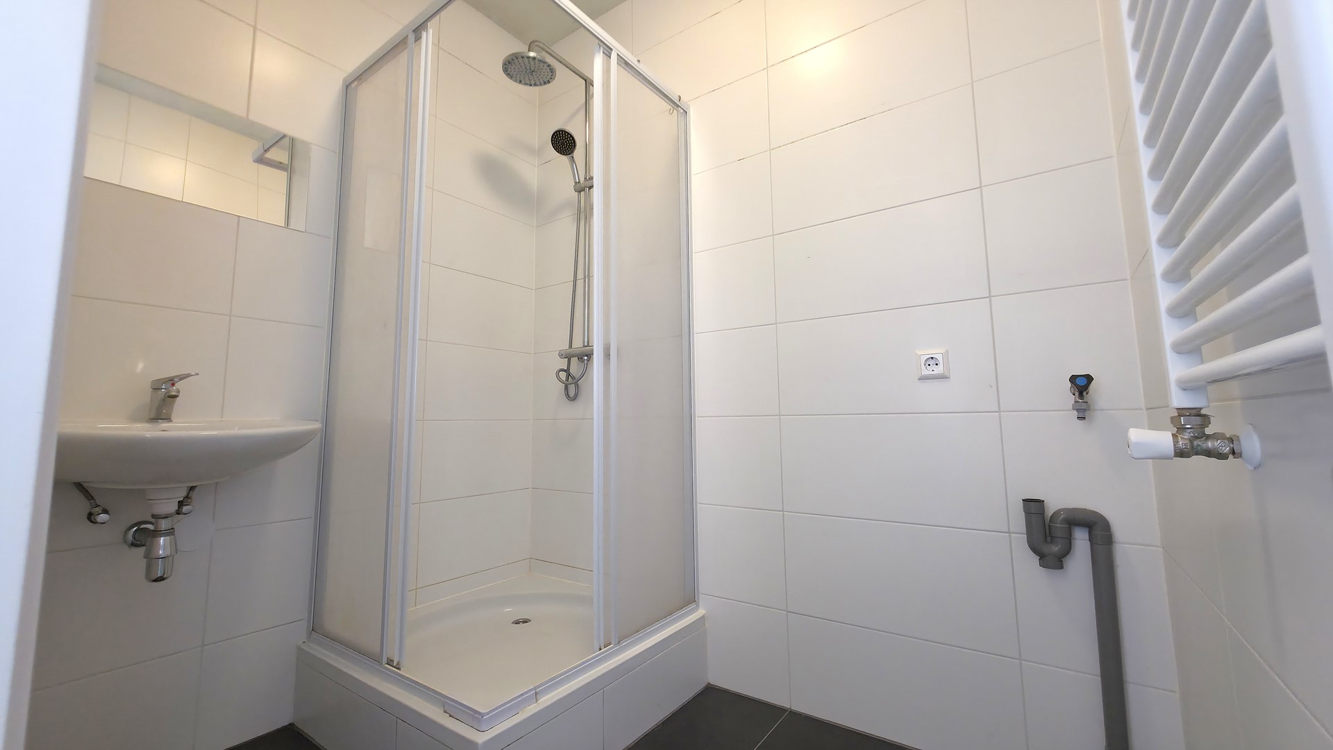 De badkamer beschikt over een nette douche, wastafel, handdoekradiator en een aansluiting voor de wasmachine, waardoor deze ruimte praktisch en compleet is ingericht.