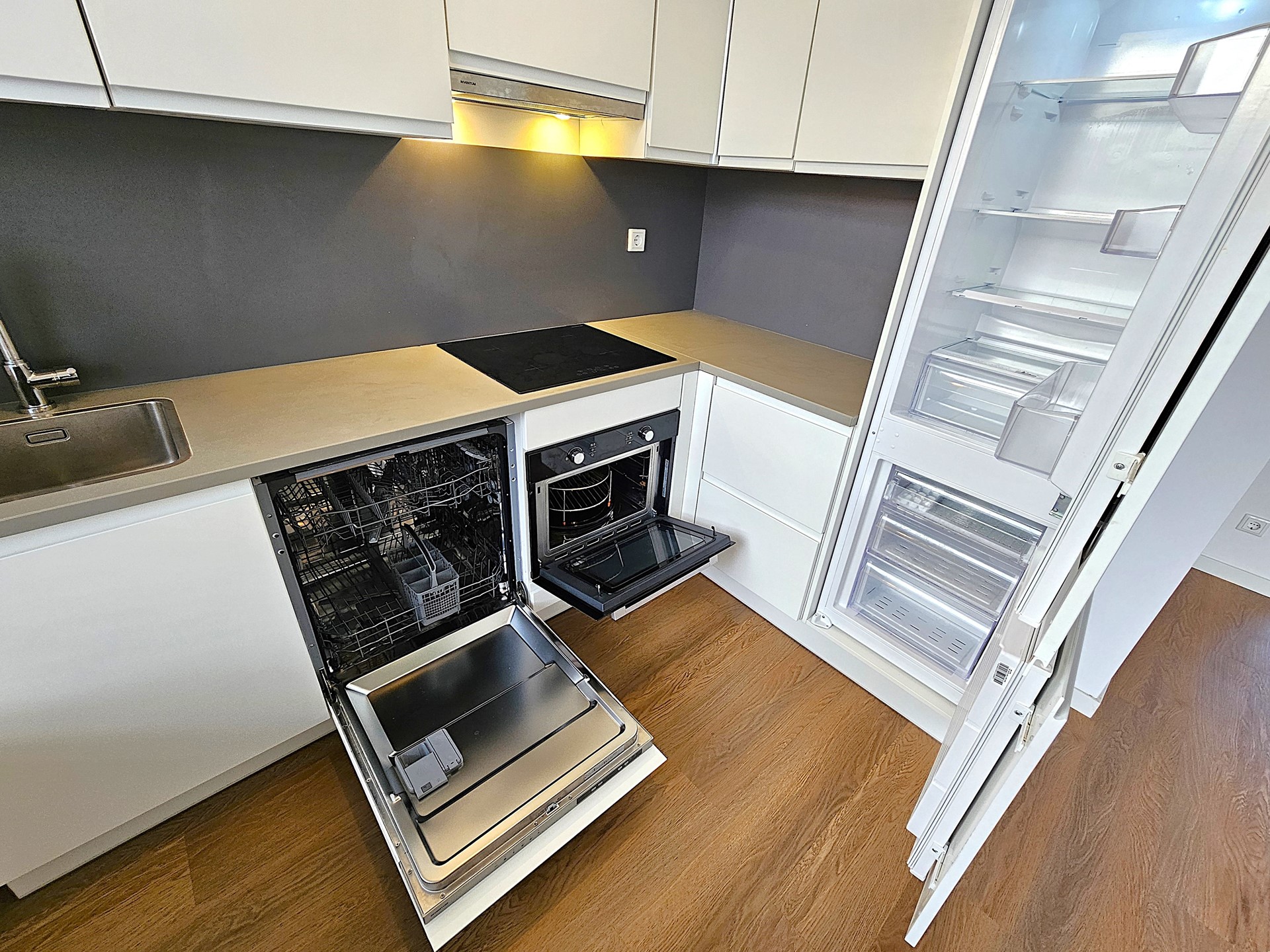 Bij binnenkomst word je direct verrast door de lichte doorzonwoonkamer met grote raampartijen en een moderne afwerking. De open keuken sluit hier naadloos op aan en is voorzien van strakke inbouwapparatuur – ideaal voor wie graag kookt en toch in contact wil blijven met de woonkamer.