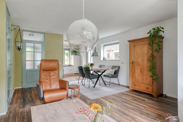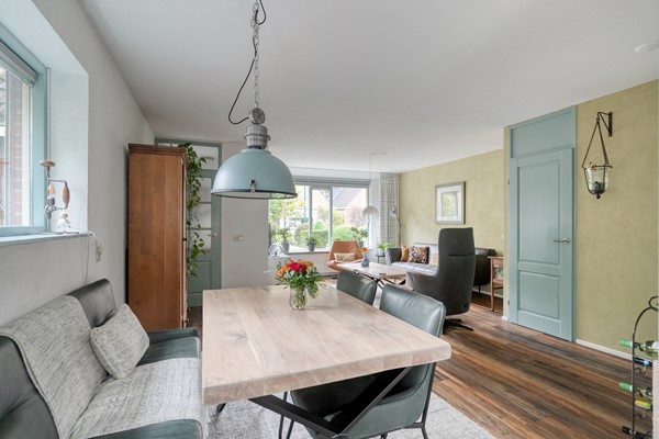 Aangrenzend aan de hal bevindt zich de ruime woonkamer, waar de open indeling zorgt voor een aangename sfeer tussen de verschillende leefruimtes. Dankzij de grote ramen valt er veel natuurlijk licht naar binnen, waardoor een warme en huiselijke sfeer ontstaat. Hier creëert u eenvoudig een gezellige zithoek en een royale eettafel voor lange avonden met familie of vrienden.