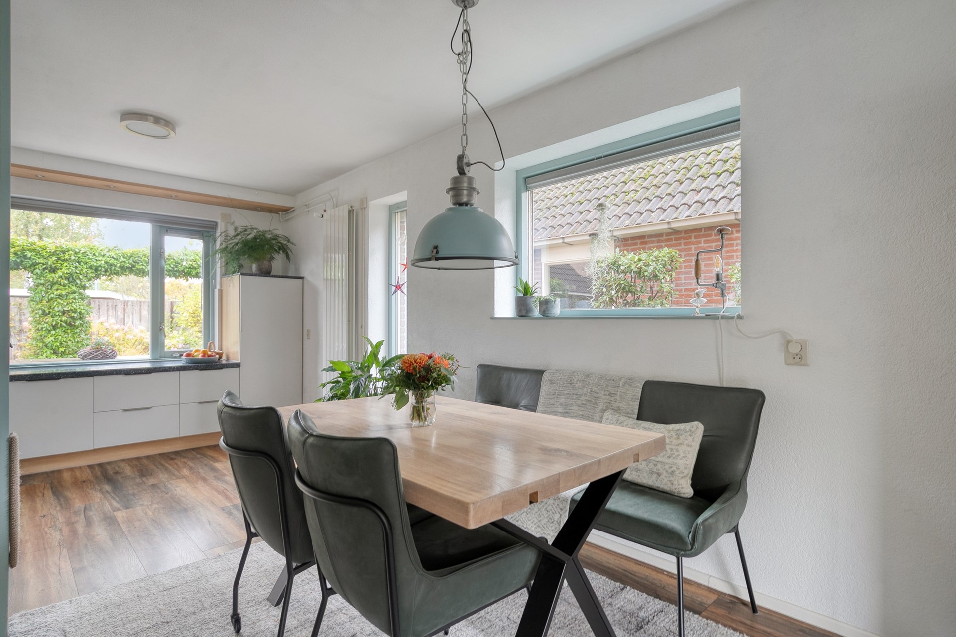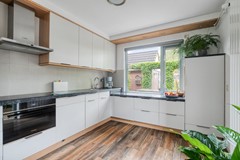 Grenzend aan de woonkamer bevindt zich de L-vormige open keuken, die niet alleen praktisch is ingedeeld maar ook in nette staat verkeert. De keuken is voorzien van moderne apparatuur, waaronder een inductiekookplaat met afzuigkap, oven, koelkast, spoelbak en volop opbergruimte in kasten en lades. Een fijne plek om de dag te beginnen met een kop koffie of uitgebreid te koken voor gasten.