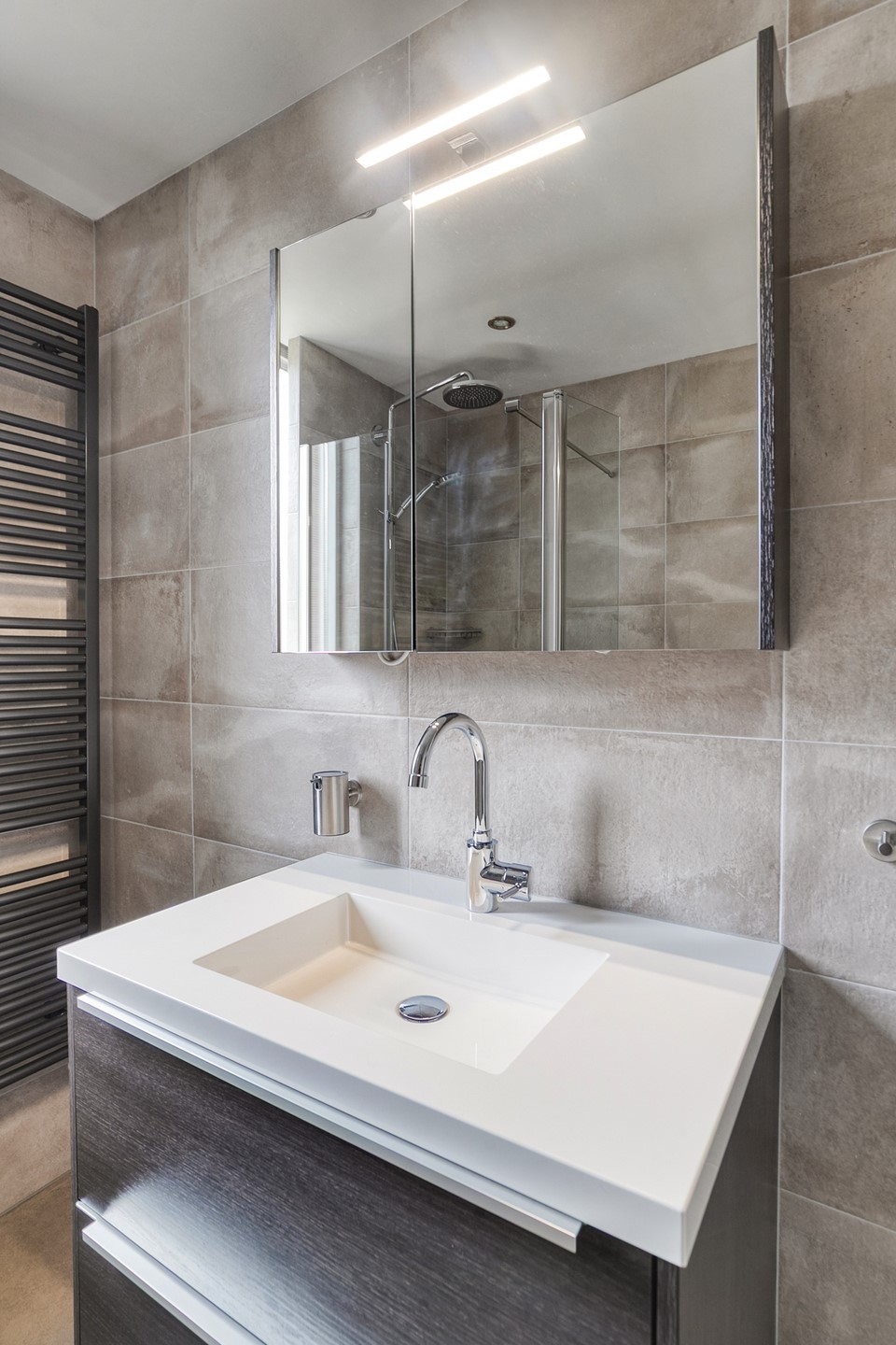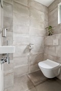De moderne badkamer is geheel betegeld en van alle gemakken voorzien. U vindt hier een douchecabine, zwevend toilet, wastafel met spiegel en een handdoekradiator. Alles verkeert in keurige staat, waardoor u zonder aanpassingen direct kunt genieten van een frisse start van de dag.