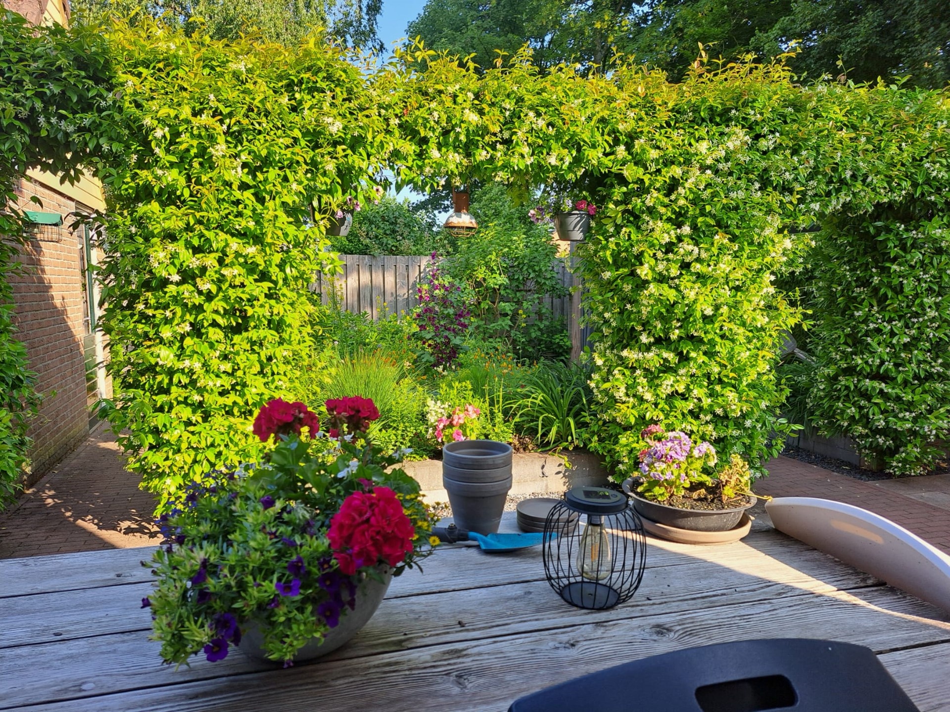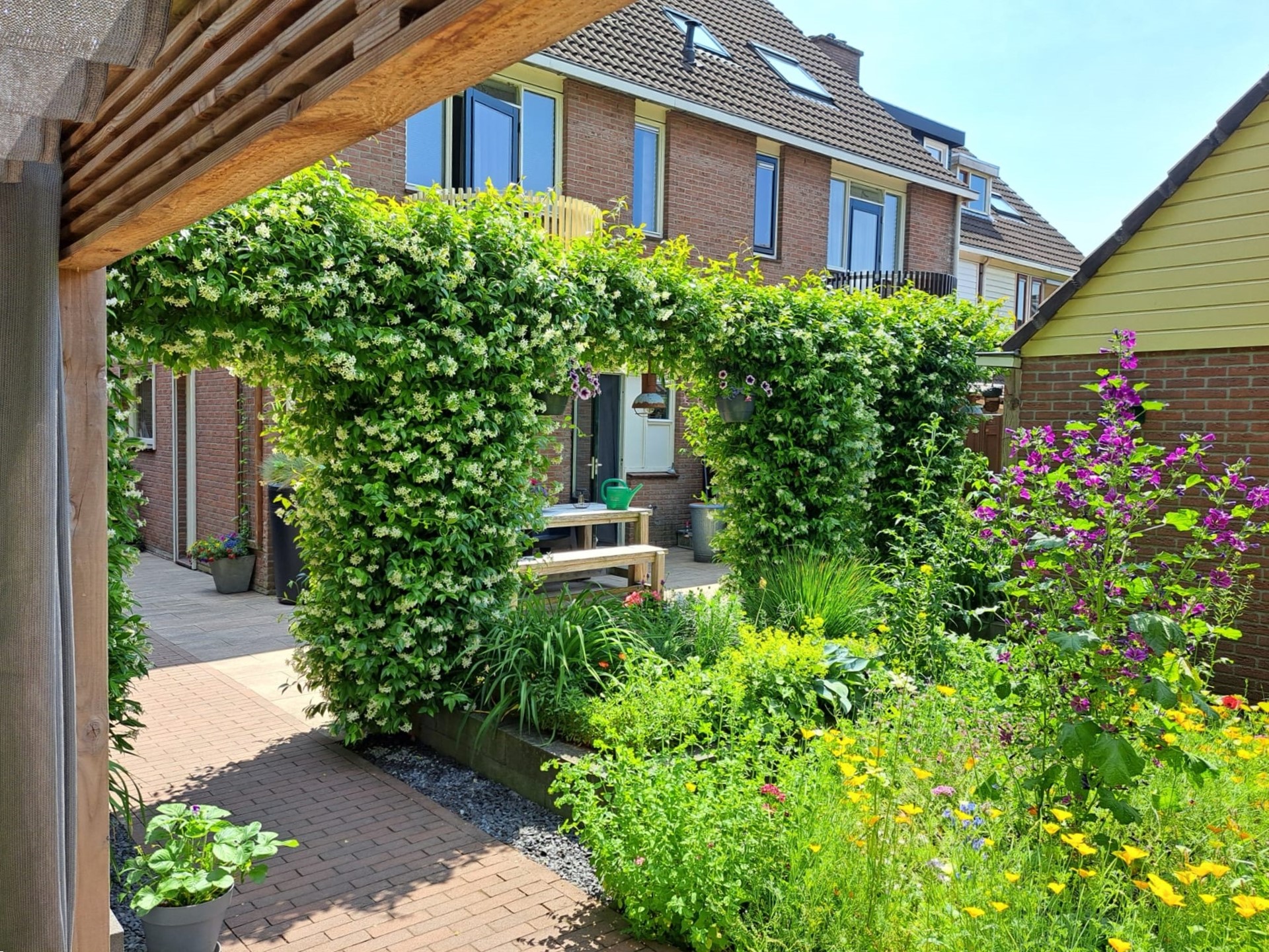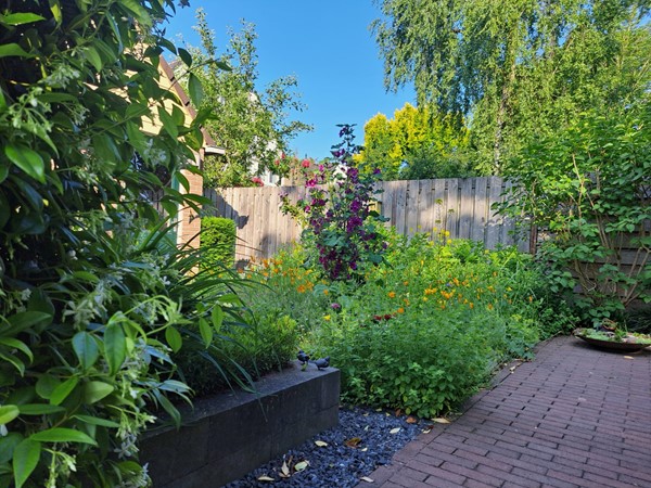 De voortuin is fraai aangelegd en geeft de woning direct een verzorgde uitstraling. Achter de woning ligt een zonnige tuin met veel privacy en groen. Hier kunt u volop genieten van het buitenleven, of u nu kiest voor een lounge set, eettafel of speelruimte voor kinderen. De tuin is onderhoudsvriendelijk aangelegd en beschikt over een berging, ideaal voor fietsen, tuingereedschap of andere spullen. Een heerlijke plek om in alle rust te ontspannen.