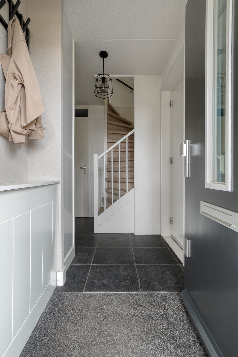 Via de verzorgde voortuin en de eigen oprit bereikt u de entree van de woning. Hier is ruimte genoeg om meerdere auto’s te parkeren, terwijl er in de directe omgeving eveneens voldoende parkeergelegenheid is. Eenmaal binnen komt u in de ruime hal, die toegang biedt tot het toilet, de woonkamer, de garage en de trap naar de eerste verdieping. De nette afwerking en de lichte uitstraling zorgen direct voor een prettige eerste indruk.