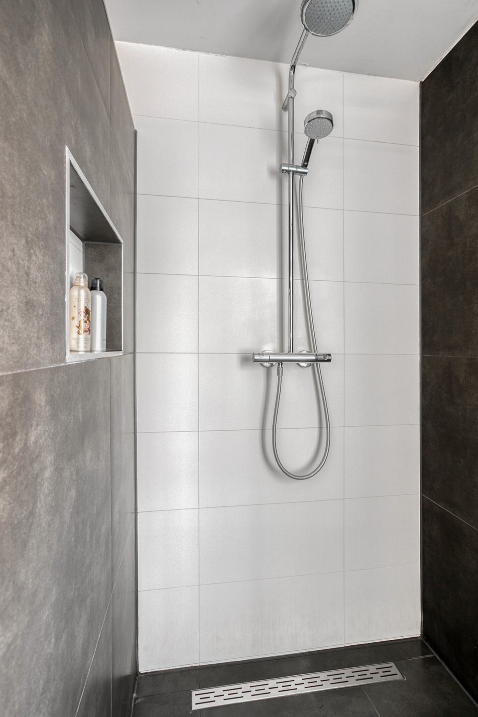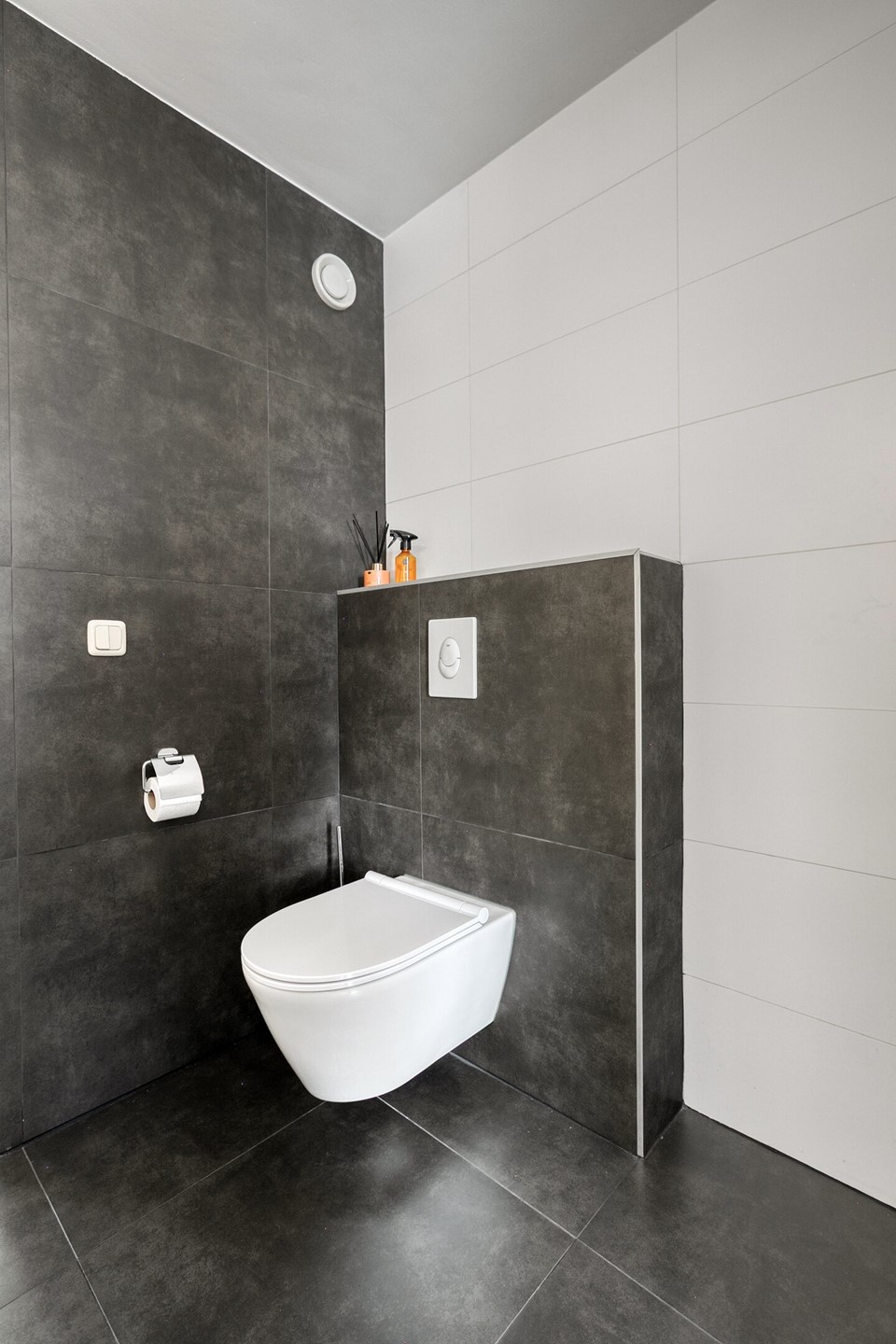 De badkamer is stijlvol betegeld en tot in de puntjes verzorgd. U vindt hier een inloopdouche met glazen wand, een zwevend toilet, en een dubbele wastafel met spiegel. De afwerking is modern en tijdloos, waardoor u hier elke dag in een frisse, ontspannen sfeer kunt beginnen of eindigen.