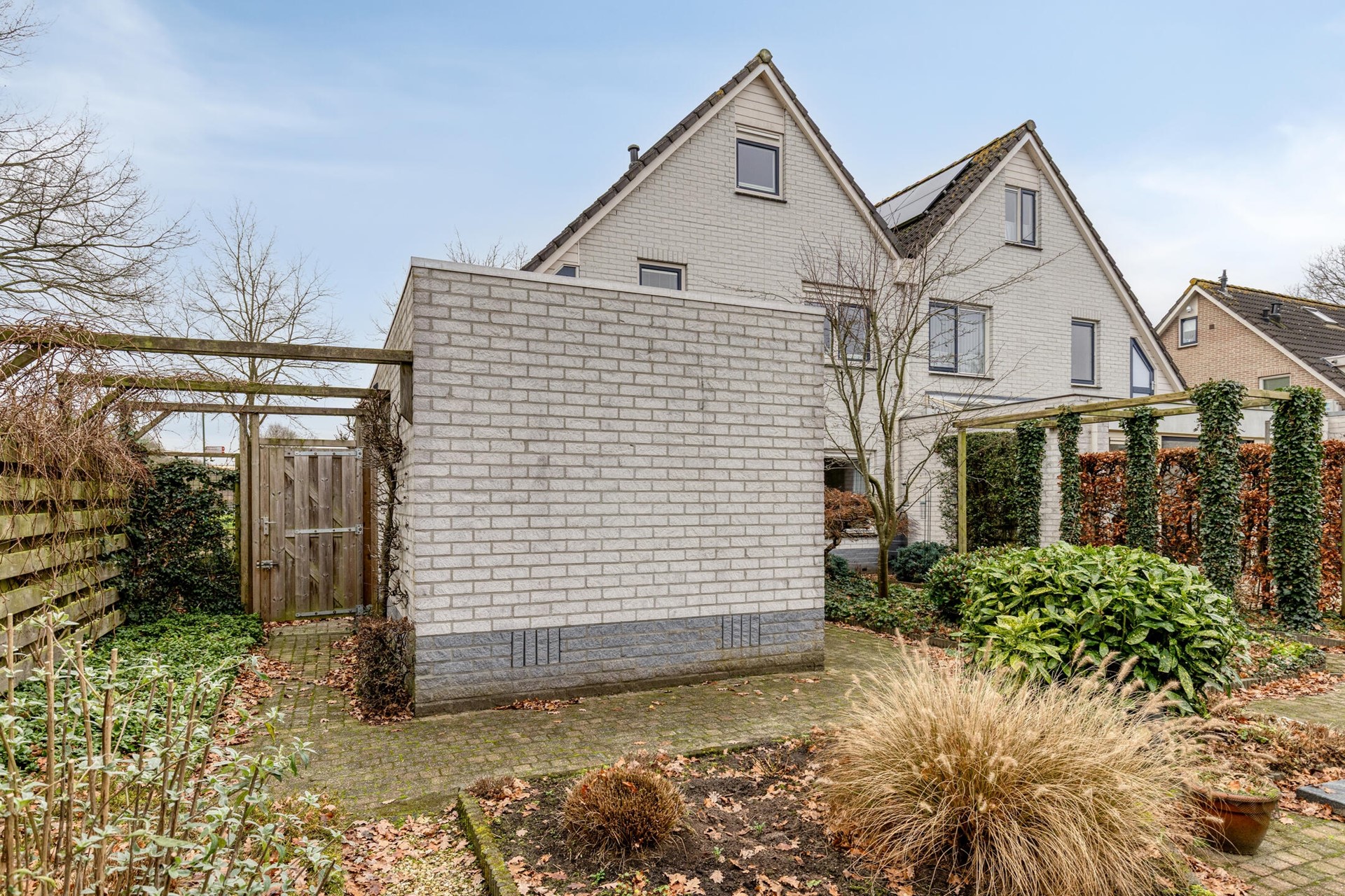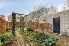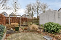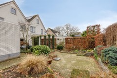 De tuin is verzorgd aangelegd en biedt een prettige mix van groen, bestrating en privacy. Meerdere zitplekken maken het mogelijk om op verschillende momenten van de dag van zon of schaduw te genieten. De erfafscheiding zorgt voor beschutting, terwijl het groen een rustige uitstraling geeft. De garage van circa 25 m² is bereikbaar via de oprit en biedt ruimte voor zowel een auto als extra opslag. De eigen oprit maakt parkeren op eigen terrein vanzelfsprekend en draagt bij aan het dagelijkse gemak.