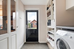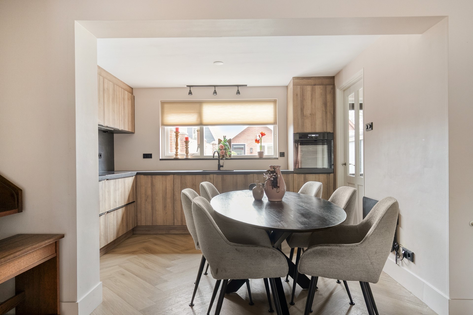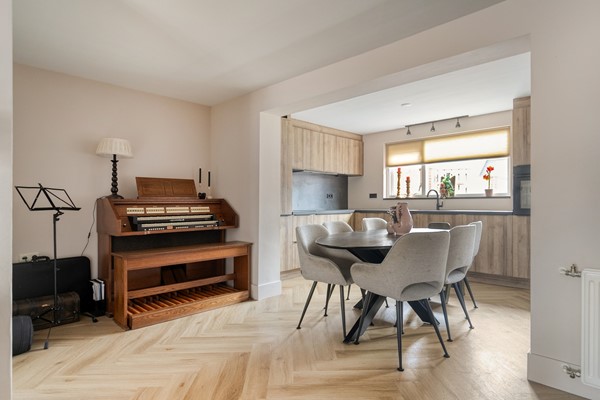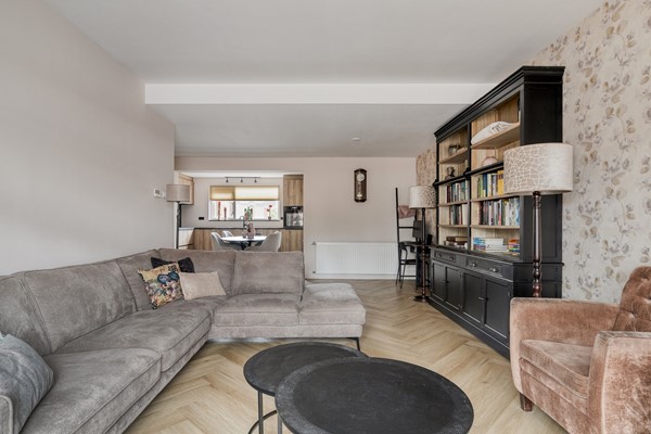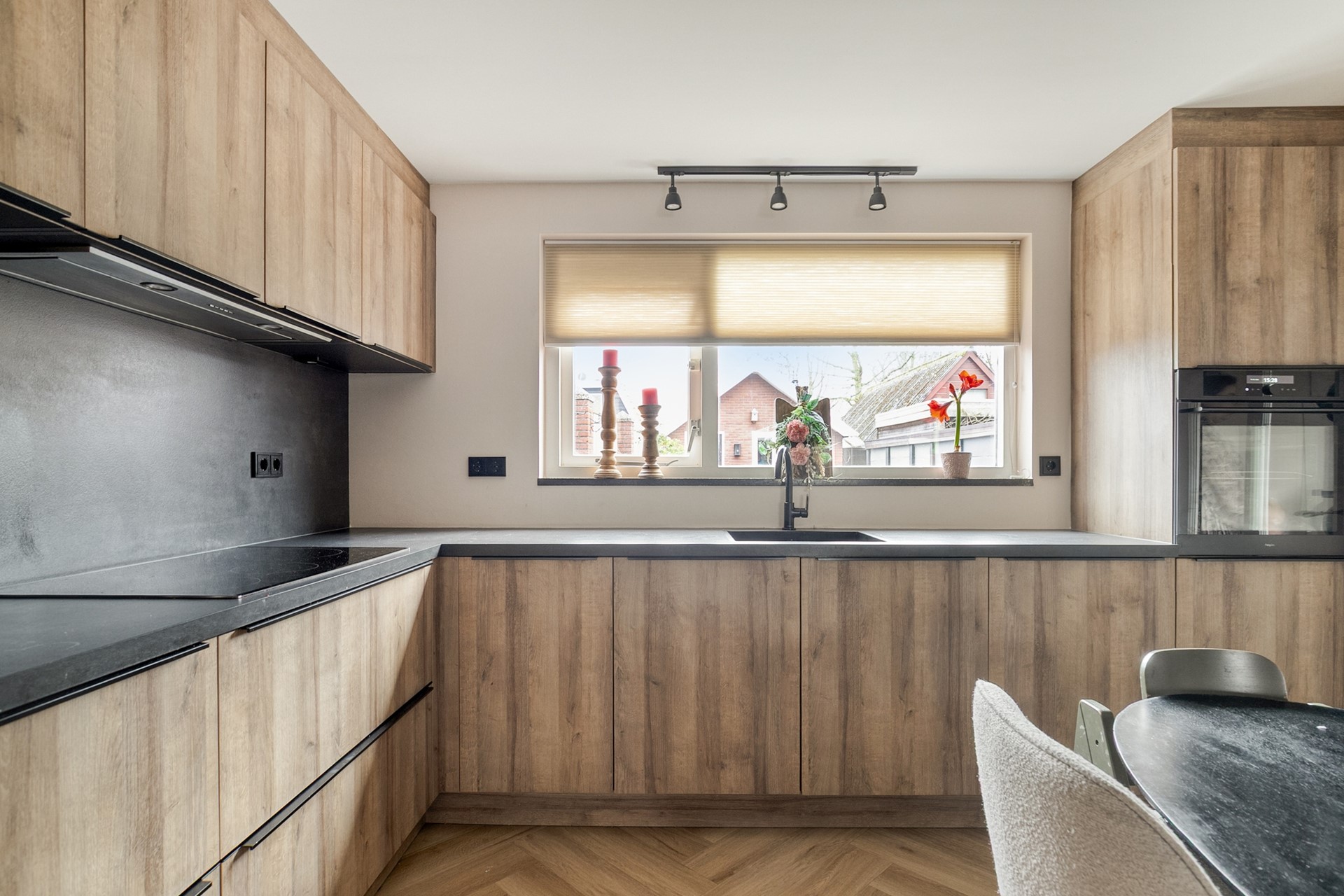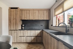 De zithoek aan de voorzijde voelt knus en geborgen, terwijl de eethoek richting de keuken een natuurlijke verbinding vormt met de achtertuin. De moderne keuken is uitgevoerd in een warme houttint met een donker werkblad en beschikt over diverse inbouwapparatuur, waaronder een inductiekookplaat, afzuigkap, oven, koel-/vriescombinatie en vaatwasser. Vanuit de keuken bereikt u de praktische bijkeuken met witgoedaansluitingen en toegang tot de tuin.