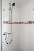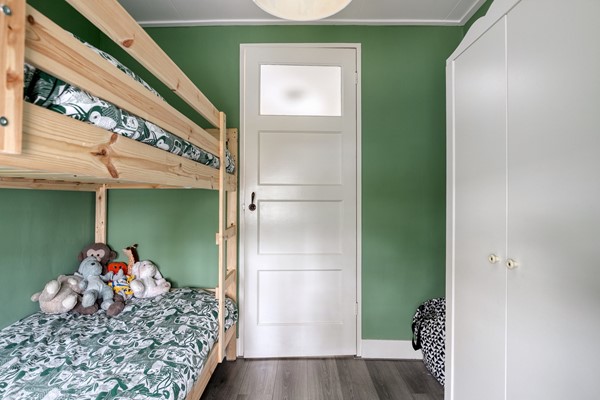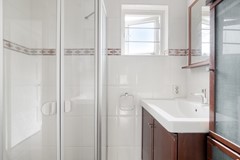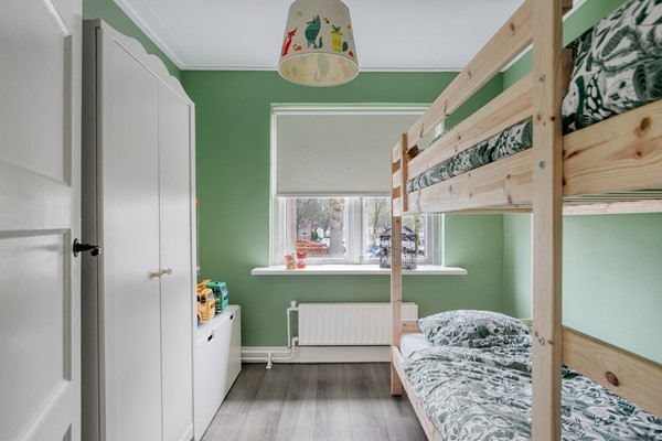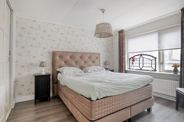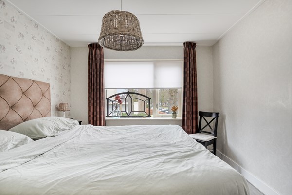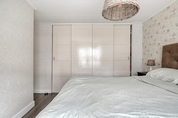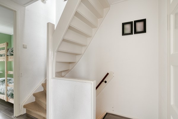 Op de eerste verdieping bevinden zich drie slaapkamers en de badkamer. De hoofdslaapkamer is ruim opgezet en beschikt over een vaste kastenwand met schuifdeuren, waardoor u volop bergruimte heeft zonder concessies te doen aan de ruimtebeleving. De andere twee kamers zijn eveneens prettig van formaat en geschikt als kinder-, werk- of logeerkamer. De badkamer is verzorgd uitgevoerd en voorzien van een douchecabine, wastafelmeubel, hoge kast en een raam voor natuurlijke ventilatie en daglicht.