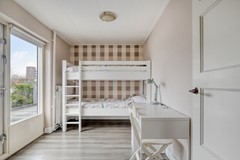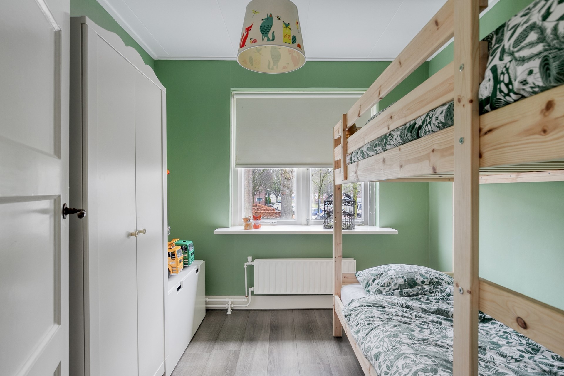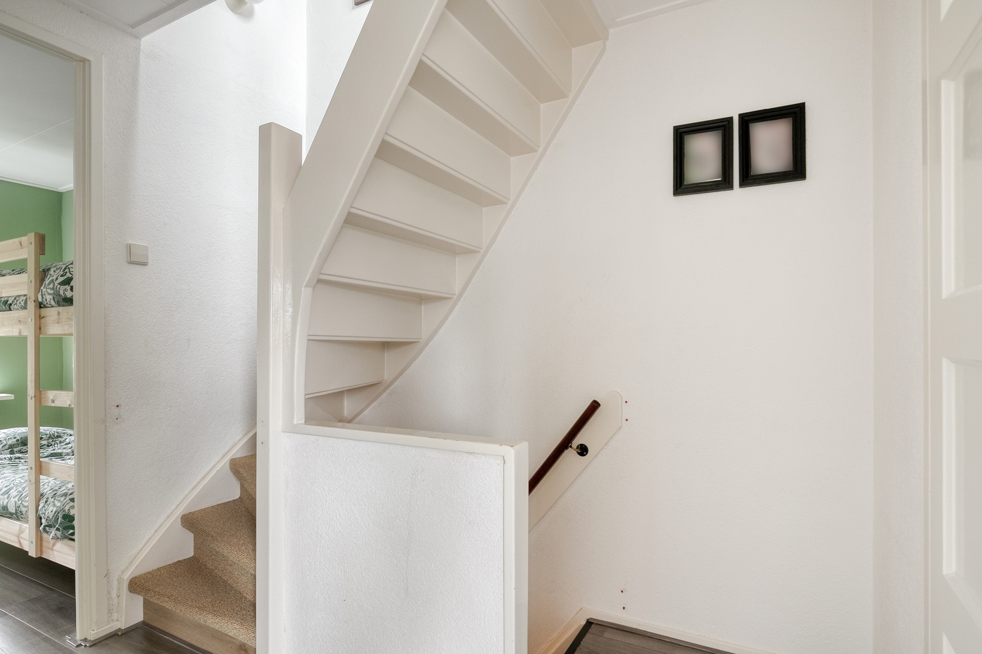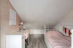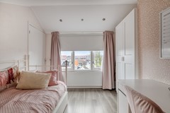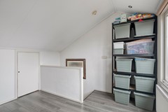 Via een vaste trap bereikt u de tweede verdieping. Hier treft u een overloop met een ruime bergkast, en er is een extra slaapkamer onder de kap. Dankzij de grote raampartij voelt deze ruimte licht aan, ideaal als tienerkamer, hobbyruimte of thuiskantoor.