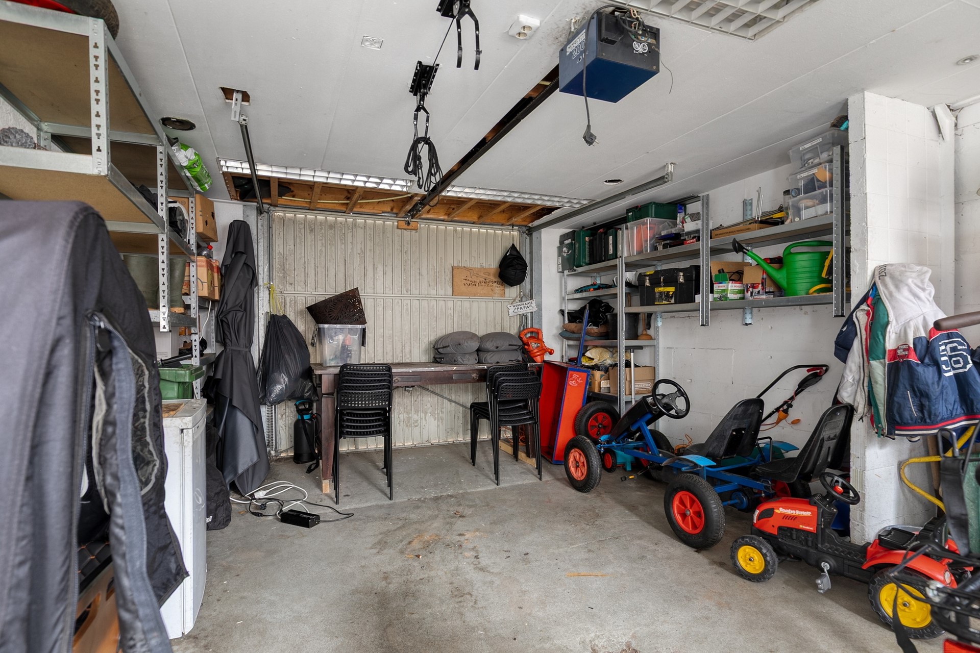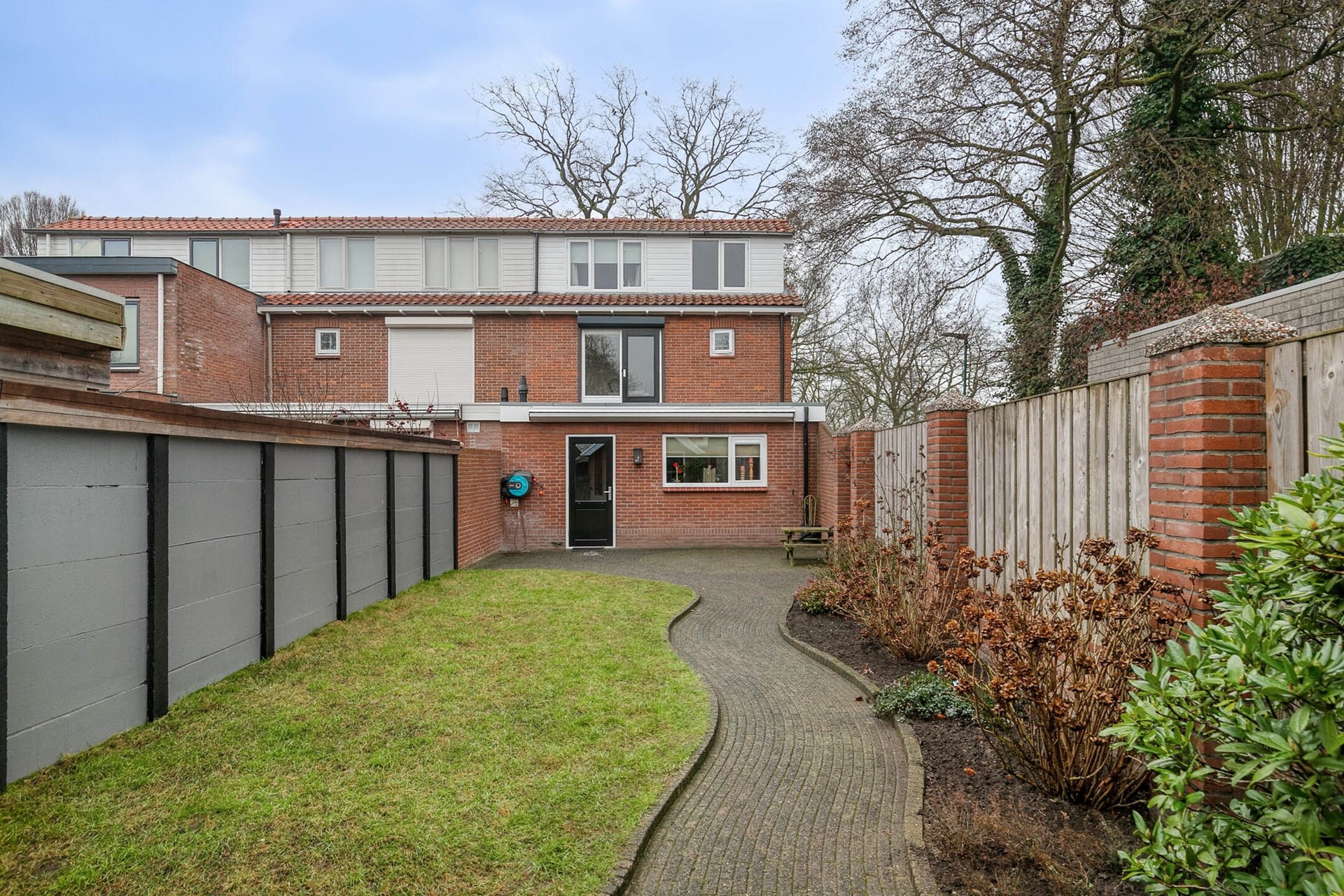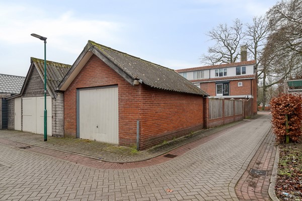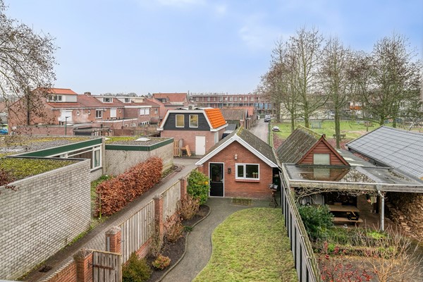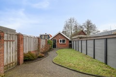 De achtertuin is verrassend diep en biedt een fijne combinatie van bestrating en groen. Het slingerende pad en de gazonstrook geven de tuin een speels karakter, terwijl de erfafscheidingen zorgen voor veel privacy. Hier is voldoende ruimte voor een loungehoek, een eettafel en speelgelegenheid voor kinderen. Achter in de tuin staat de vrijstaande garage, voorzien van een eigen bergzolder. Dit maakt de garage niet alleen geschikt voor het stallen van een auto of fietsen, maar ook als extra opslag- of hobbyruimte. Via de achterom is de tuin bovendien gemakkelijk bereikbaar.