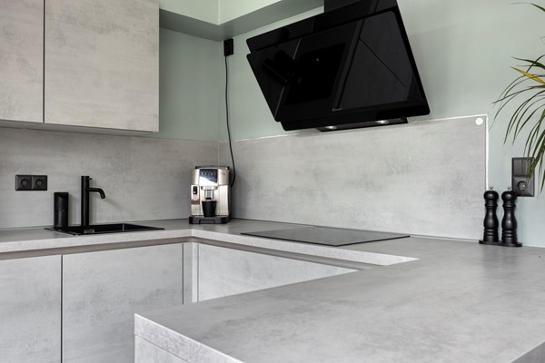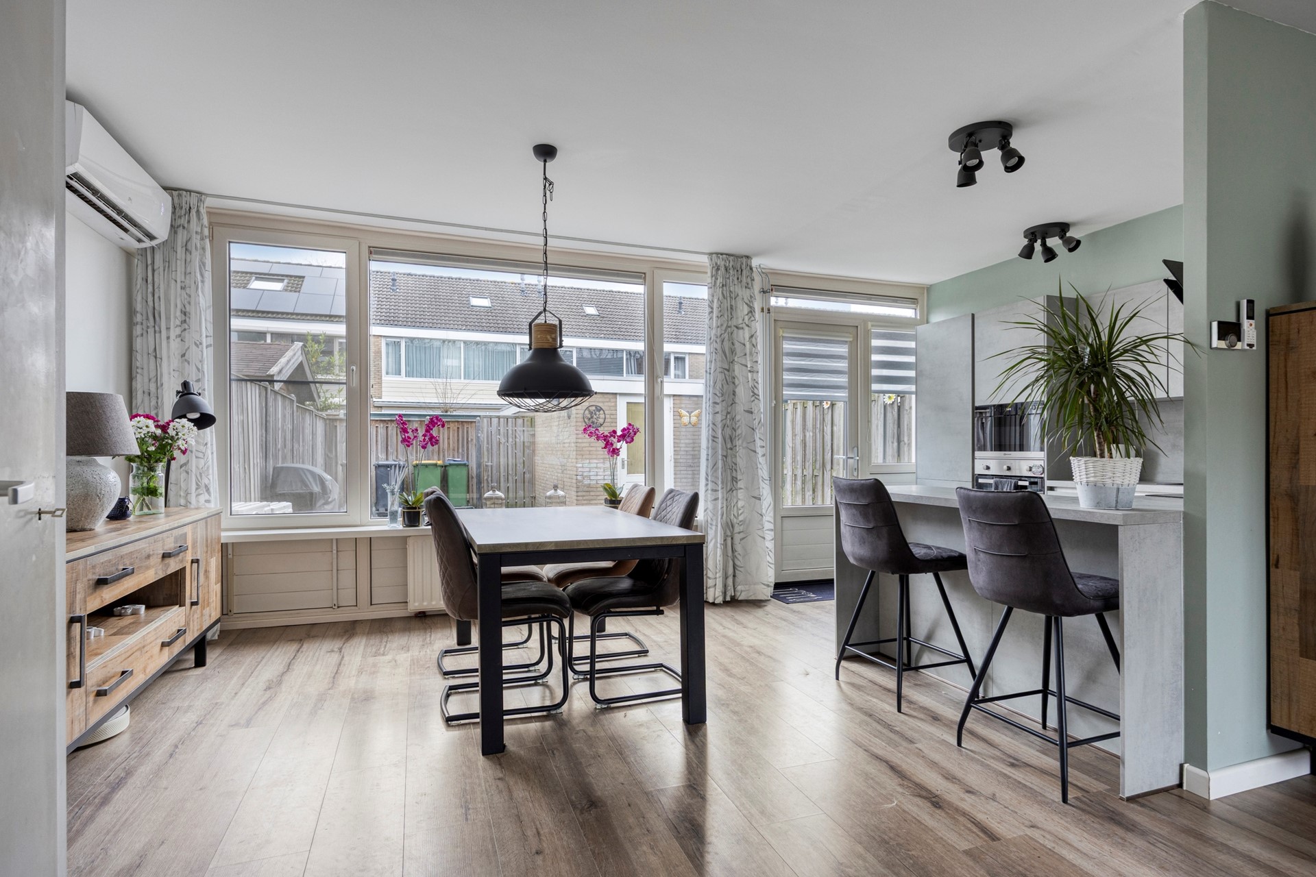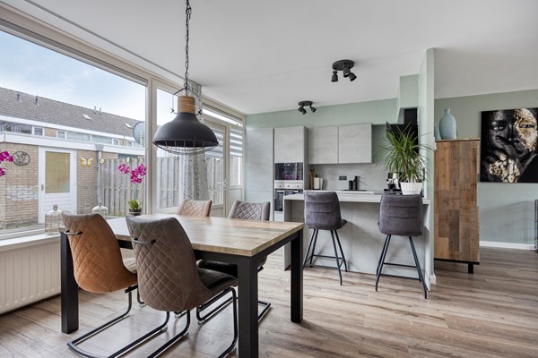 Aan de achterzijde van de woning bevindt zich de moderne, open keuken met praktische U-opstelling. U beschikt hier over een inductiekookplaat met afzuigkap, een oven, een magnetron, een vaatwasser, een koelkast en een ruime spoelbak. De lades en kastjes bieden veel opbergruimte, waardoor alles netjes en overzichtelijk blijft. Het barretje vormt een gezellige plek om even koffie te drinken of aan te schuiven tijdens het koken. Bovendien kijkt u vanuit de keuken fijn uit over de achtertuin.