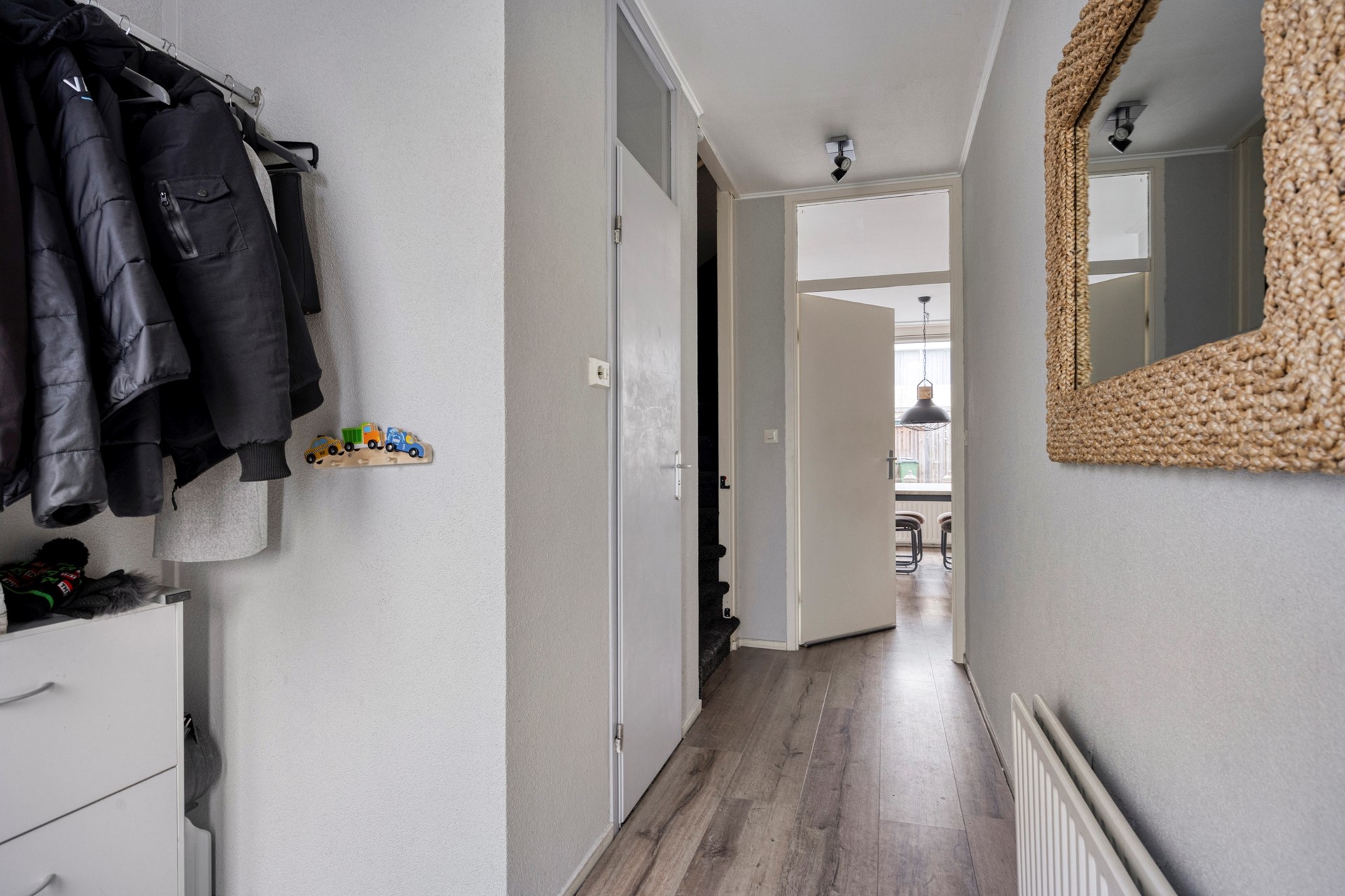 Via de voortuin bereikt u de entree van de woning. In de straat is voldoende parkeergelegenheid aanwezig, waardoor u altijd dichtbij uw eigen voordeur kunt parkeren. Eenmaal binnen komt u in de ruime hal. Vanuit hier heeft u toegang tot de lichte woonkamer, de moderne toiletruimte, de open keuken én de trap naar de eerste verdieping.