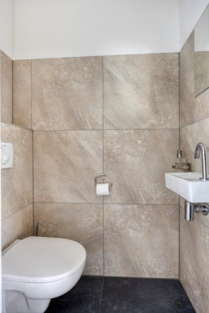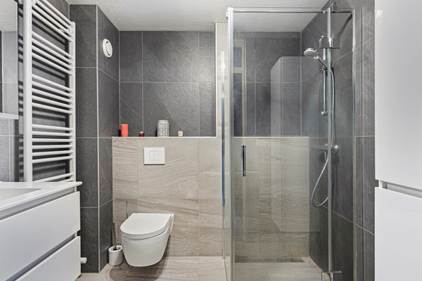 De moderne, volledig betegelde badkamer ligt eveneens aan de overloop. Deze is verzorgd afgewerkt en compleet uitgerust met een ruime douche met glazen deur, een zwevend toilet en een wastafel met spiegel. De badkamer is instapklaar en biedt alles wat u nodig heeft om de dag comfortabel te beginnen of ontspannen af te sluiten.