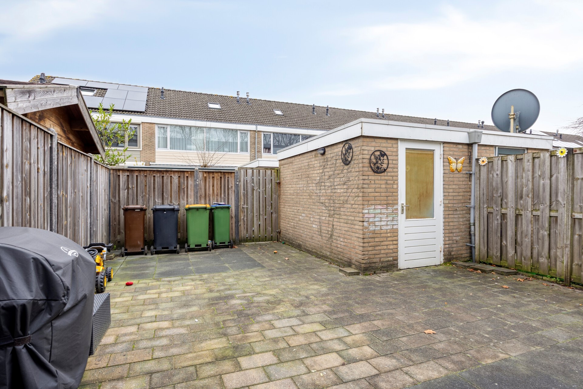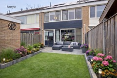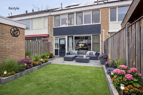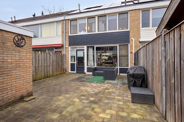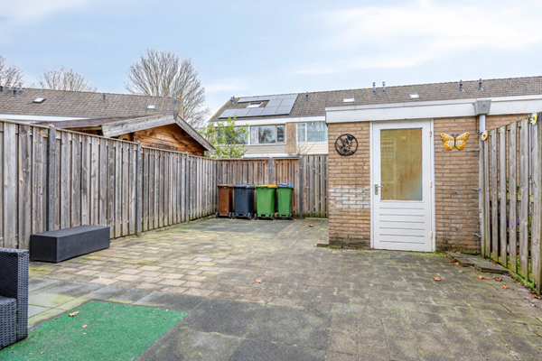 De zonnige achtertuin is grotendeels bestraat, waardoor u meerdere plekken heeft om een lounge set, eettafel of speelruimte te creëren. Dankzij de gunstige ligging geniet u in de achtertuin en in de voortuin hier tot laat op de dag van de zon. Achterin de tuin vindt u een praktische, vrijstaande berging die perfect is voor het opbergen van fietsen, gereedschap of tuinmeubelen. Bovendien heeft de tuin een achterom, wat voor extra comfort zorgt.