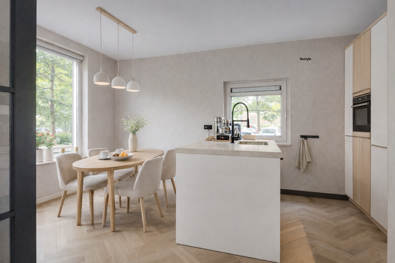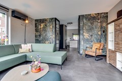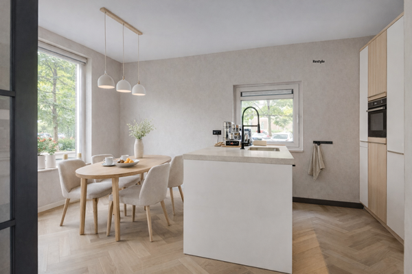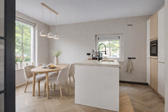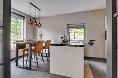 De woonkeuken, eveneens bereikbaar via de taatsdeuren, vormt het hart van de woning. Een heerlijke plek om samen te komen met familie en vrienden. De keuken is luxe uitgevoerd met een composiet werkblad, een royaal spoeleiland, inductiekookplaat met warmhoudplaat, combimagnetron, vaatwasser, ruime koelkast en volop bergruimte.