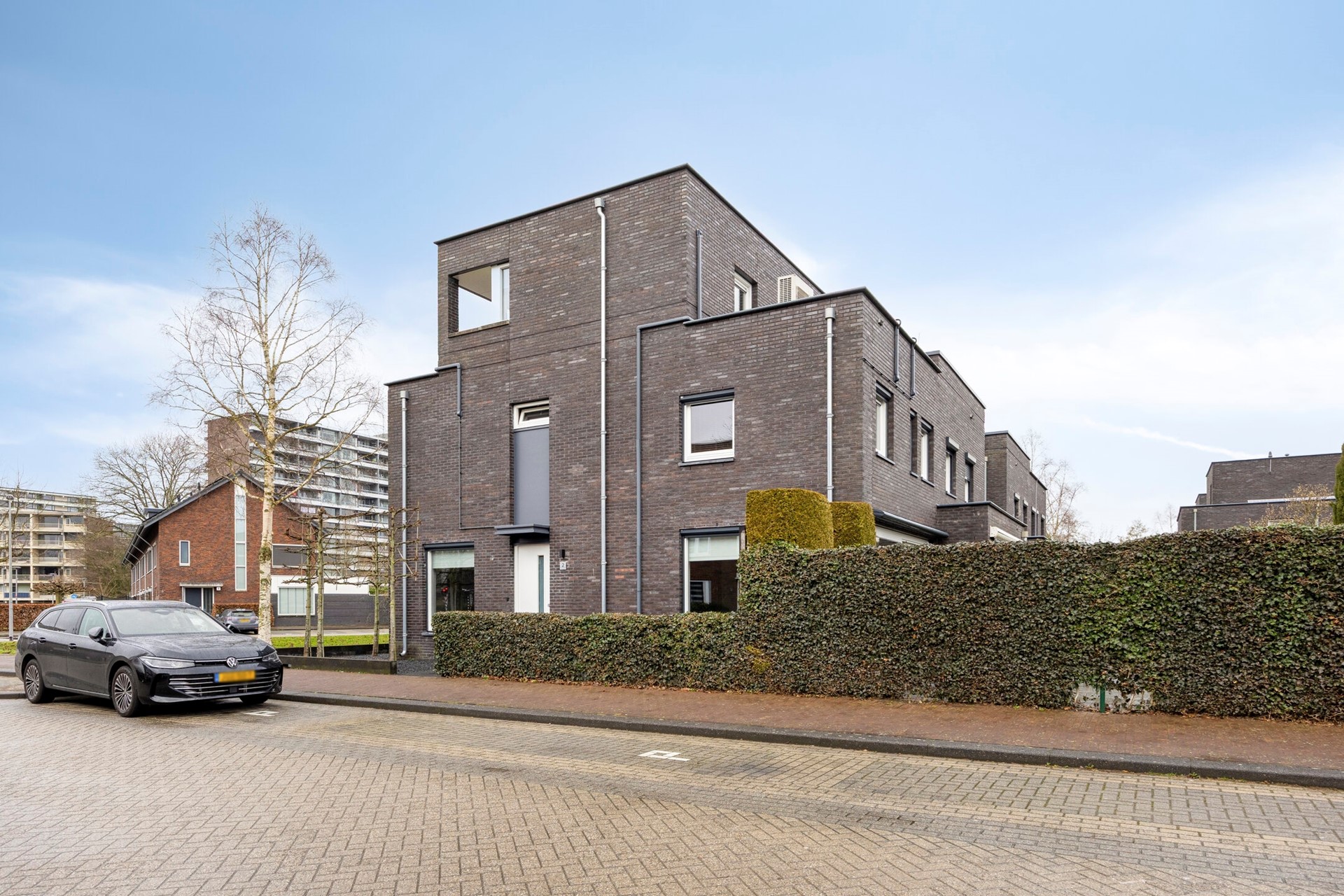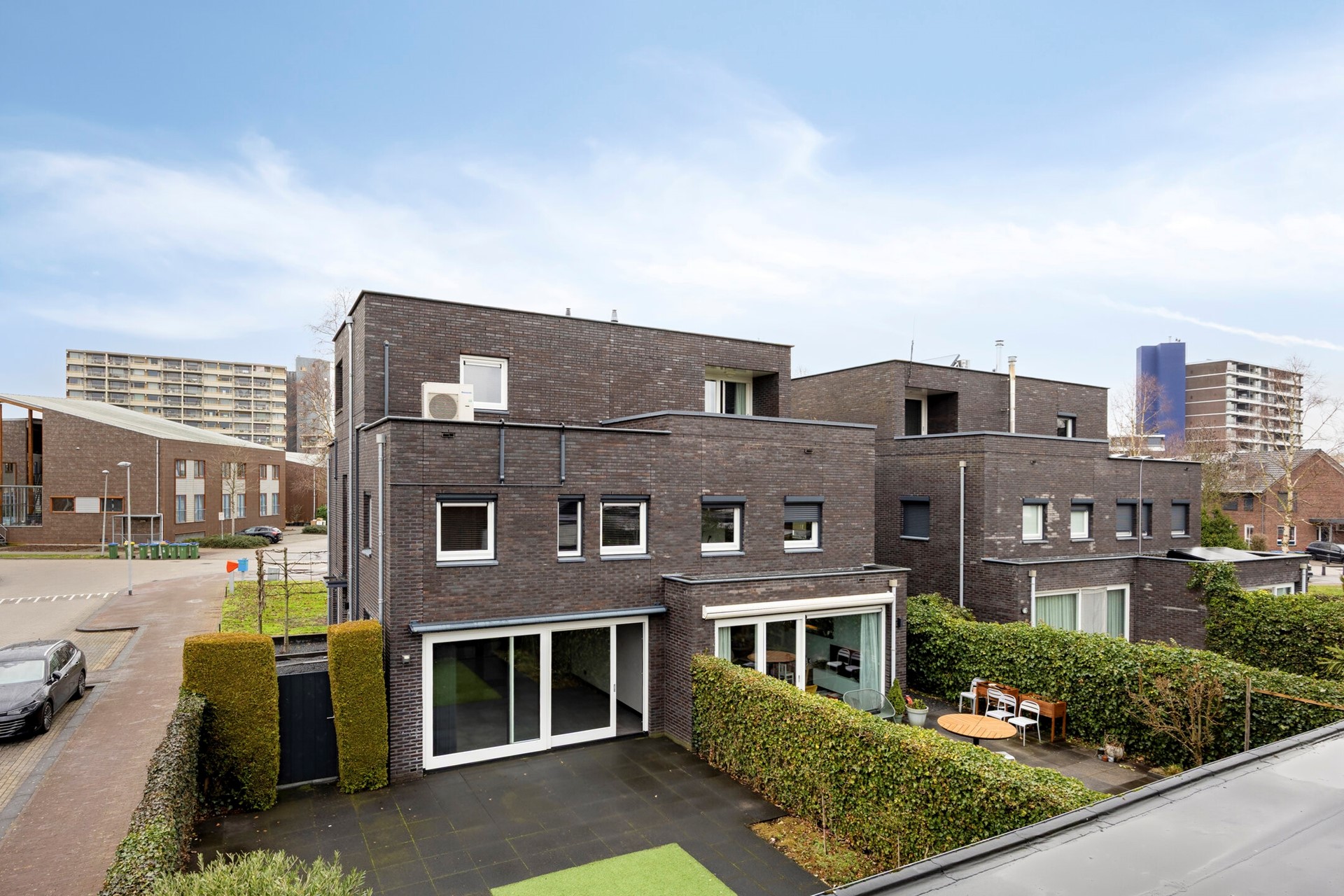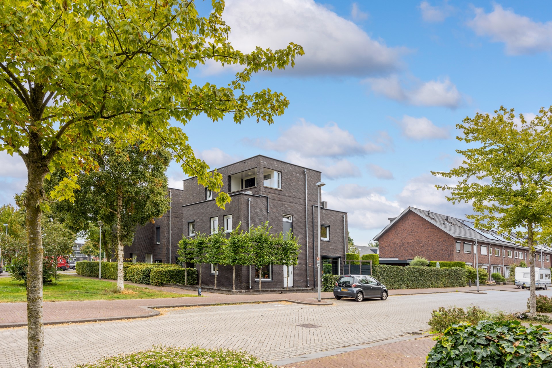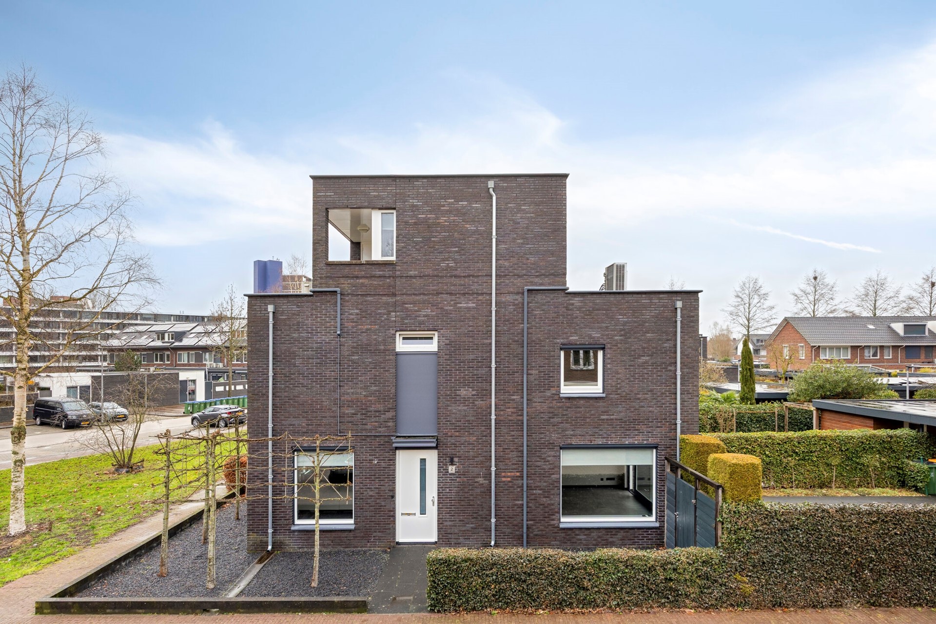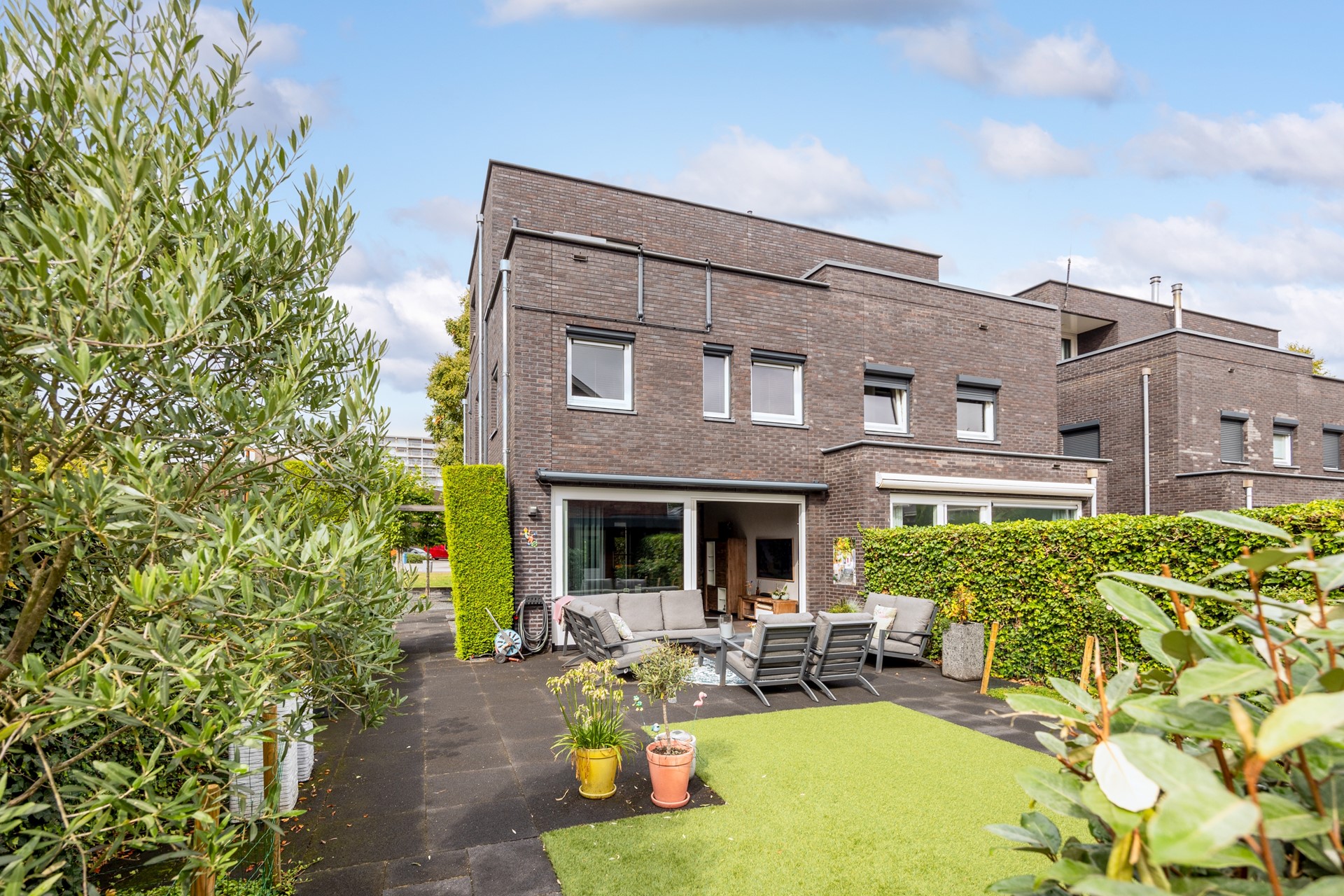 De voortuin is verzorgd aangelegd met grind en leibomen, passend bij de moderne uitstraling van de woning. De zonnige achtertuin is fraai ingericht met borders, kunstgras en een ruim terras, waardoor binnen en buiten naadloos in elkaar overlopen.