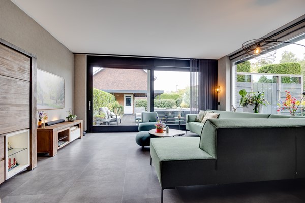 De ruime entree verwelkomt je met een praktische indeling, inclusief garderoberuimte, een moderne toiletruimte en een handige bergkast. Via stijlvolle taatsdeuren bereik je de lichte, tuingerichte woonkamer met schuifpui naar de achtertuin. De pvc-vloer met vloerverwarming en airconditioning zorgen het hele jaar door voor optimaal comfort.